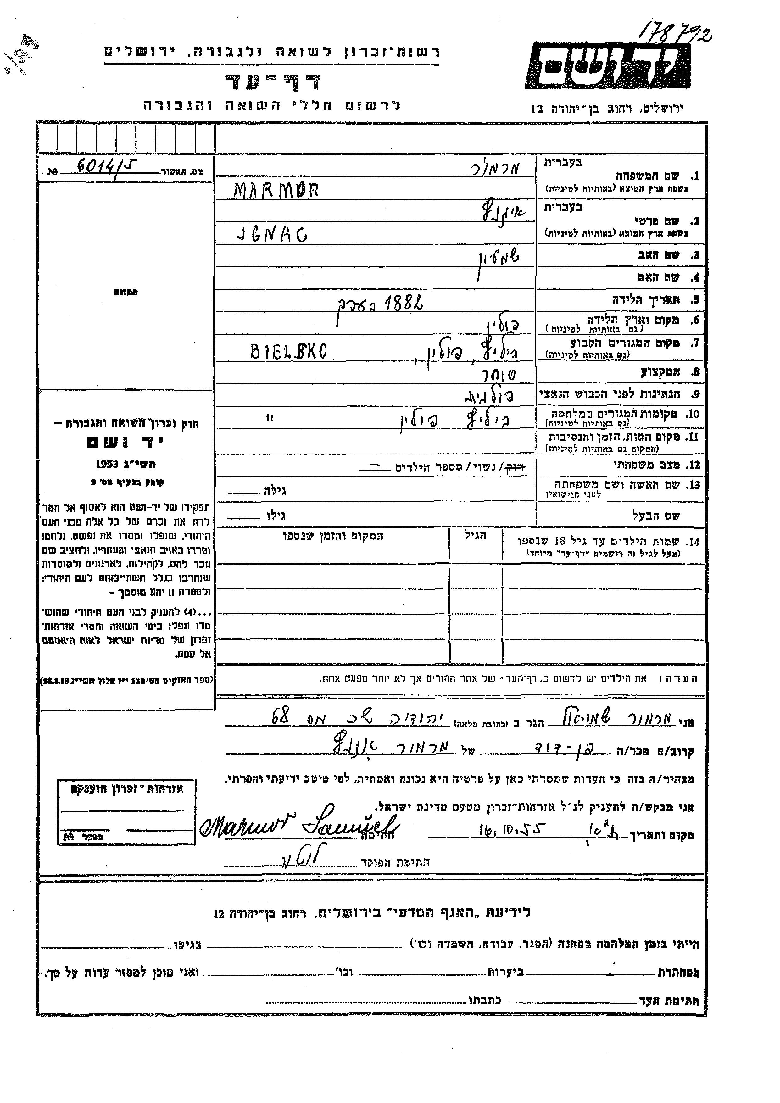 Ignac מרמור נולד בפולין בשנת 1882 לשמעון. הוא היה סוחר ורווק. לפני מלחמת העולם השניה התגורר בBielsko שבפולין. בזמן המלחמה הוא היה בBielsko שבפולין.