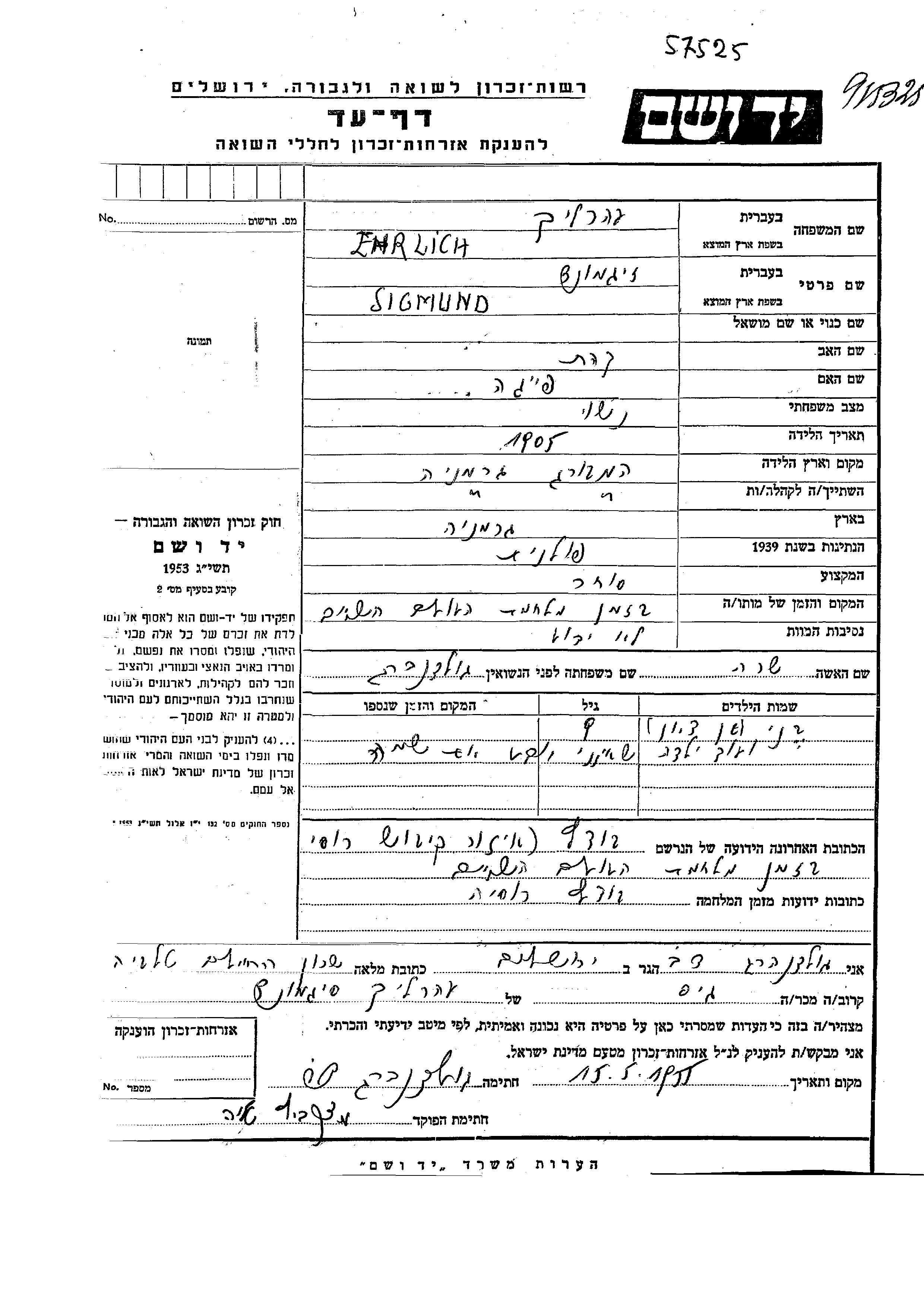 סיגמונד Ehrlich נולד בHamburg שבגרמניה בשנת 1905 לקהת ופייגה. הוא היה סוחר ונשוי לשרה לבית גולדנברג. לפני מלחמת העולם השניה התגורר ב<> (<>), גרמניה שבגרמניה. בזמן המלחמה הוא היה בBudes שברומניה. סיגמונד נרצח בשואה.