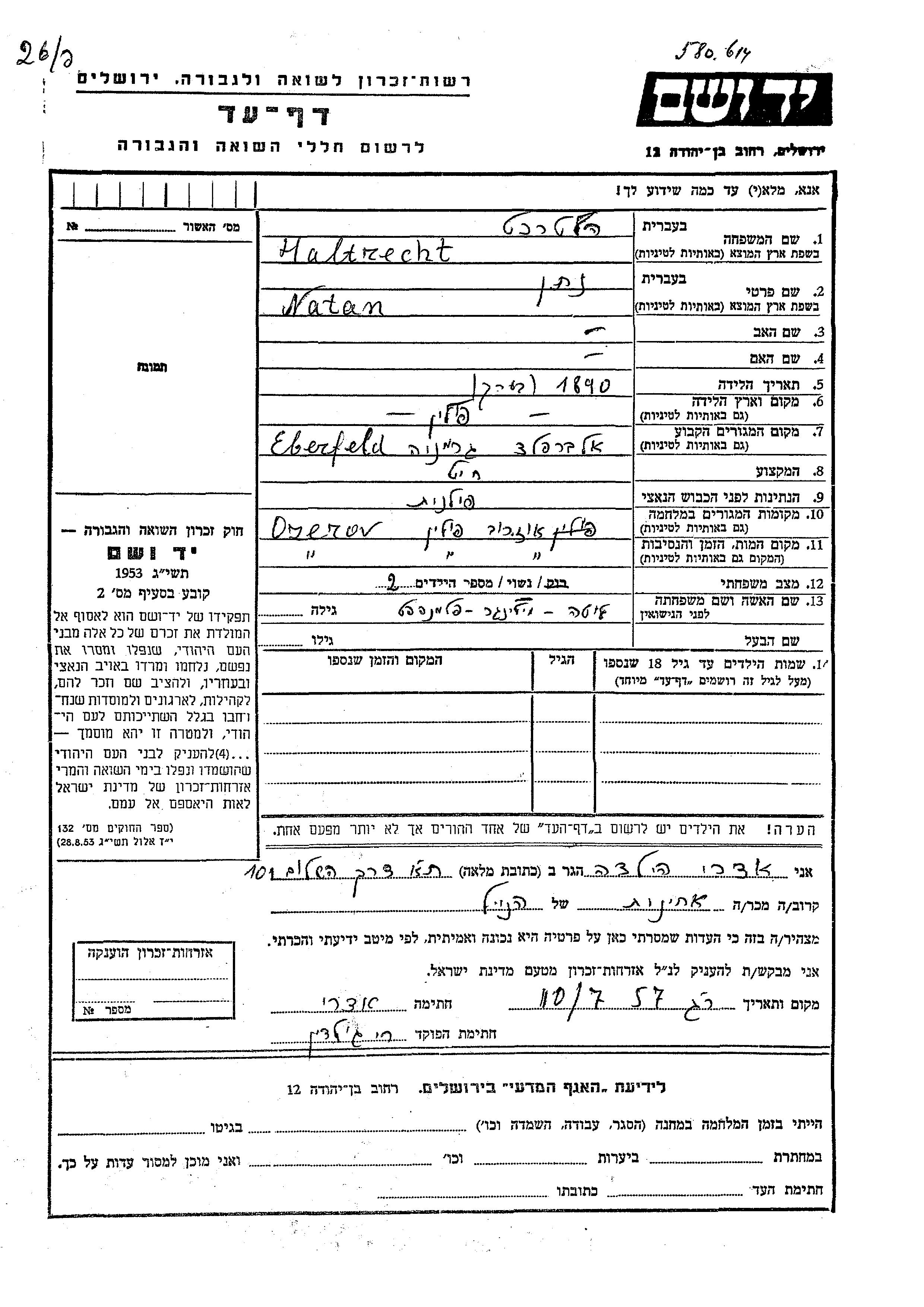 נתן Haltrecht נולד בפולין בשנת 1890. הוא היה חייט ונשוי לליטה לבית וילינגר. לפני מלחמת העולם השניה התגורר בElberfeld שבגרמניה. בזמן המלחמה הוא היה בOzerow שבפולין. נתן נרצח בשואה. מקום המוות: Ozerow שבפולין.