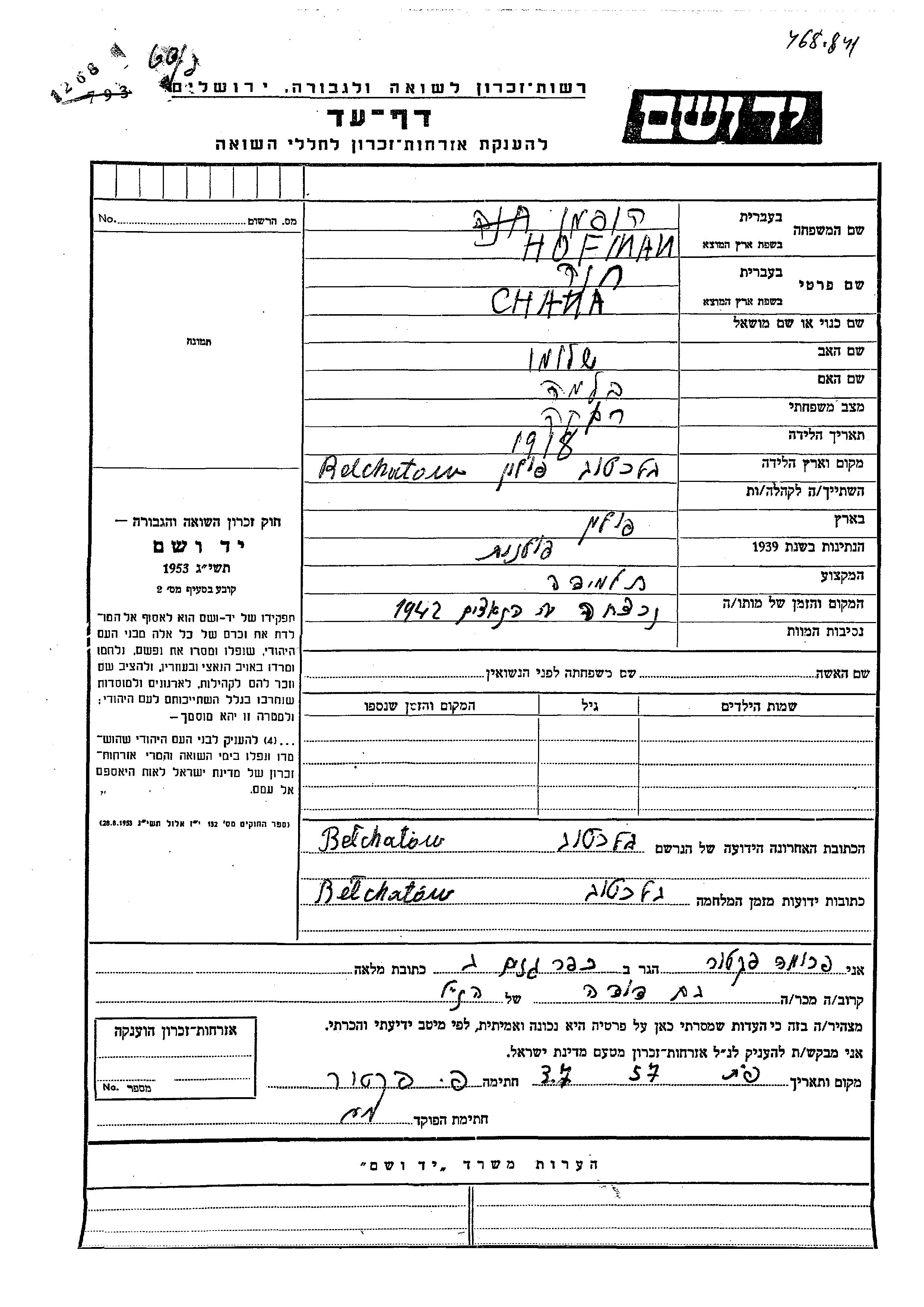 הופמן חנה 1918 Bełchatów, פולין דף-עד