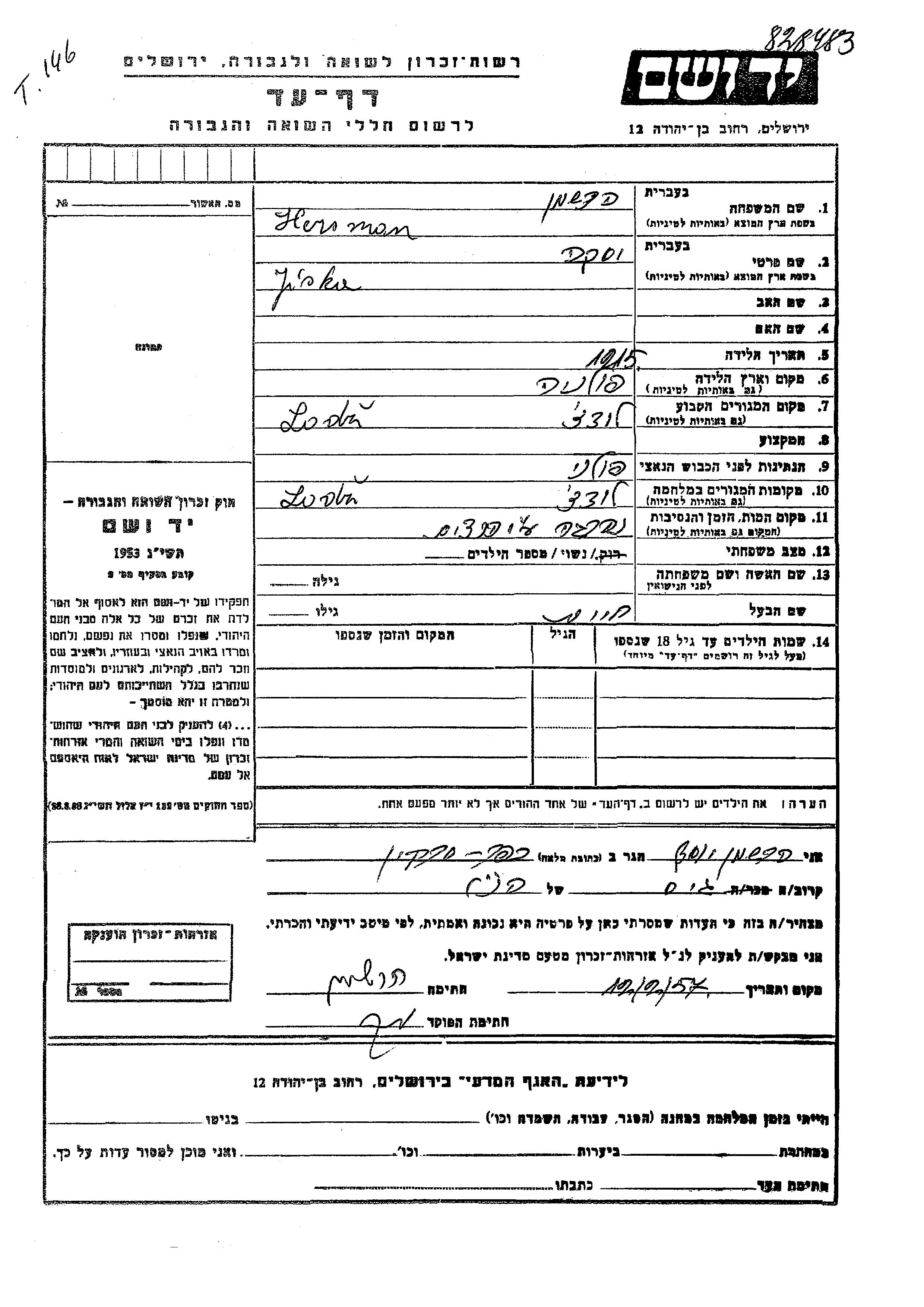 עיר/כפר, גטו/מחנה או אתר רצח או מחוז/אזור או מדינה. שם מקום ניתן לחפש רק בא-ב לטיני.