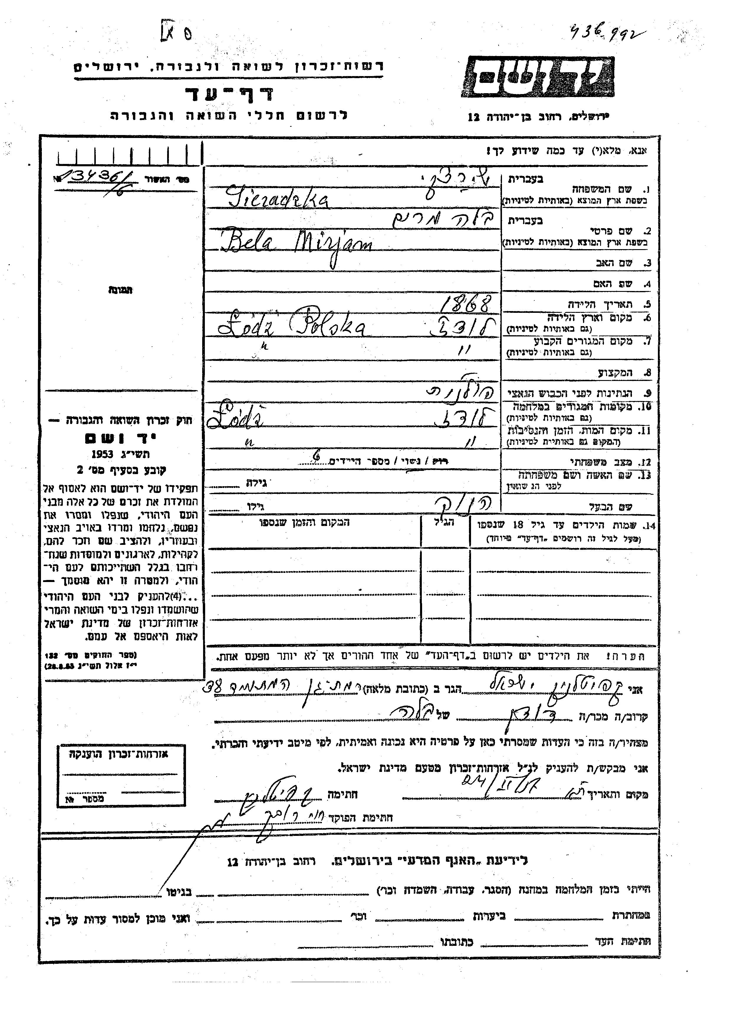 Mirjam בלה Sieradzki נולדה בLodz שבפולין בשנת 1868. היא היתה נשואה להנוך. לפני מלחמת העולם השניה התגוררה בLodz שבפולין. בזמן המלחמה היא היתה בLodz שבפולין. היא נרצחה בשואה. מקום המוות: Lodz שבפולין.