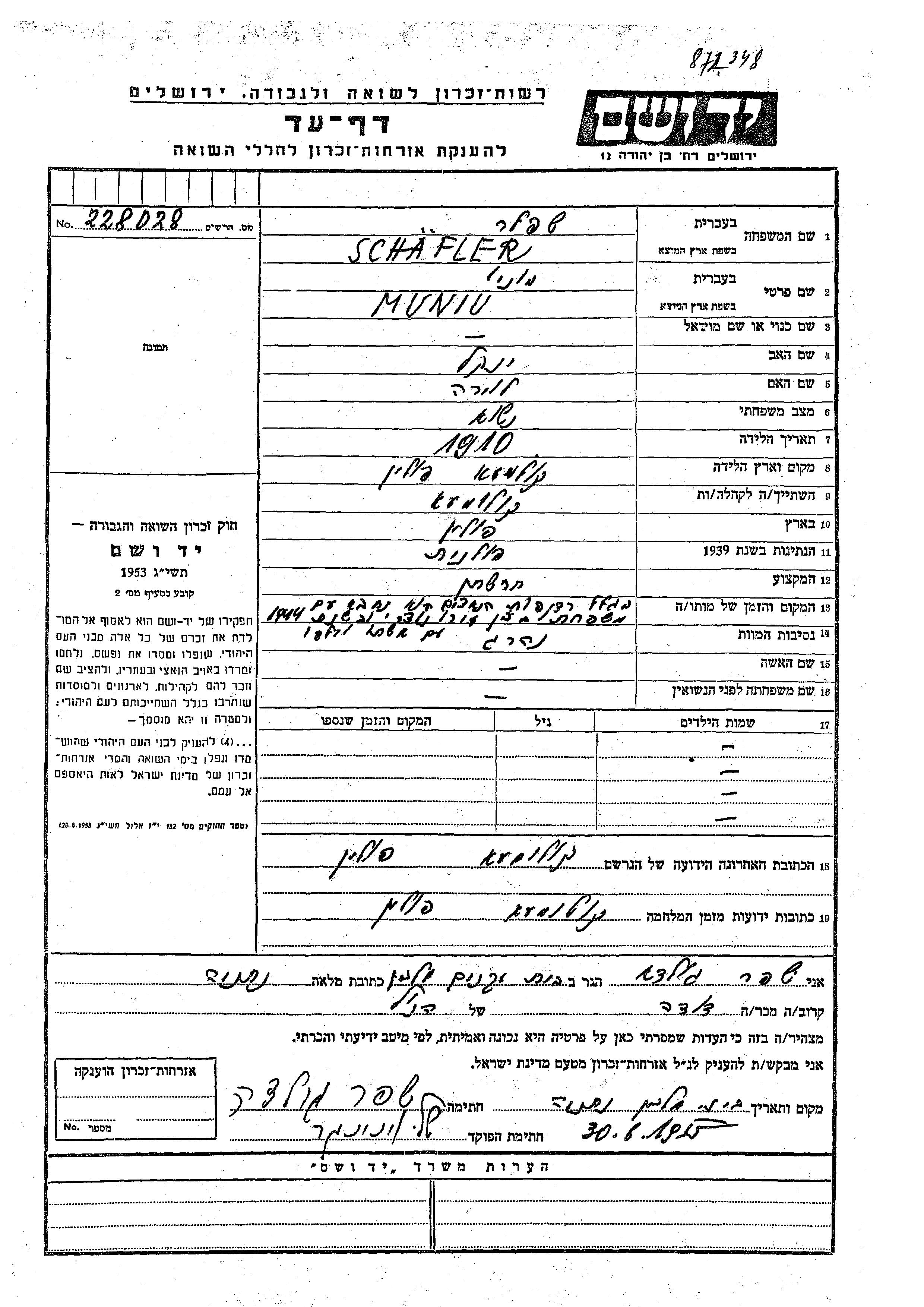 Muniu Schafler נולד בKolomyja שבפולין בשנת 1910 לינקל ולוירה. הוא היה בעל בית חרושת ונשוי. לפני מלחמת העולם השניה התגורר בKolomyja שבפולין. בזמן המלחמה הוא היה בKolomyja שבפולין.
