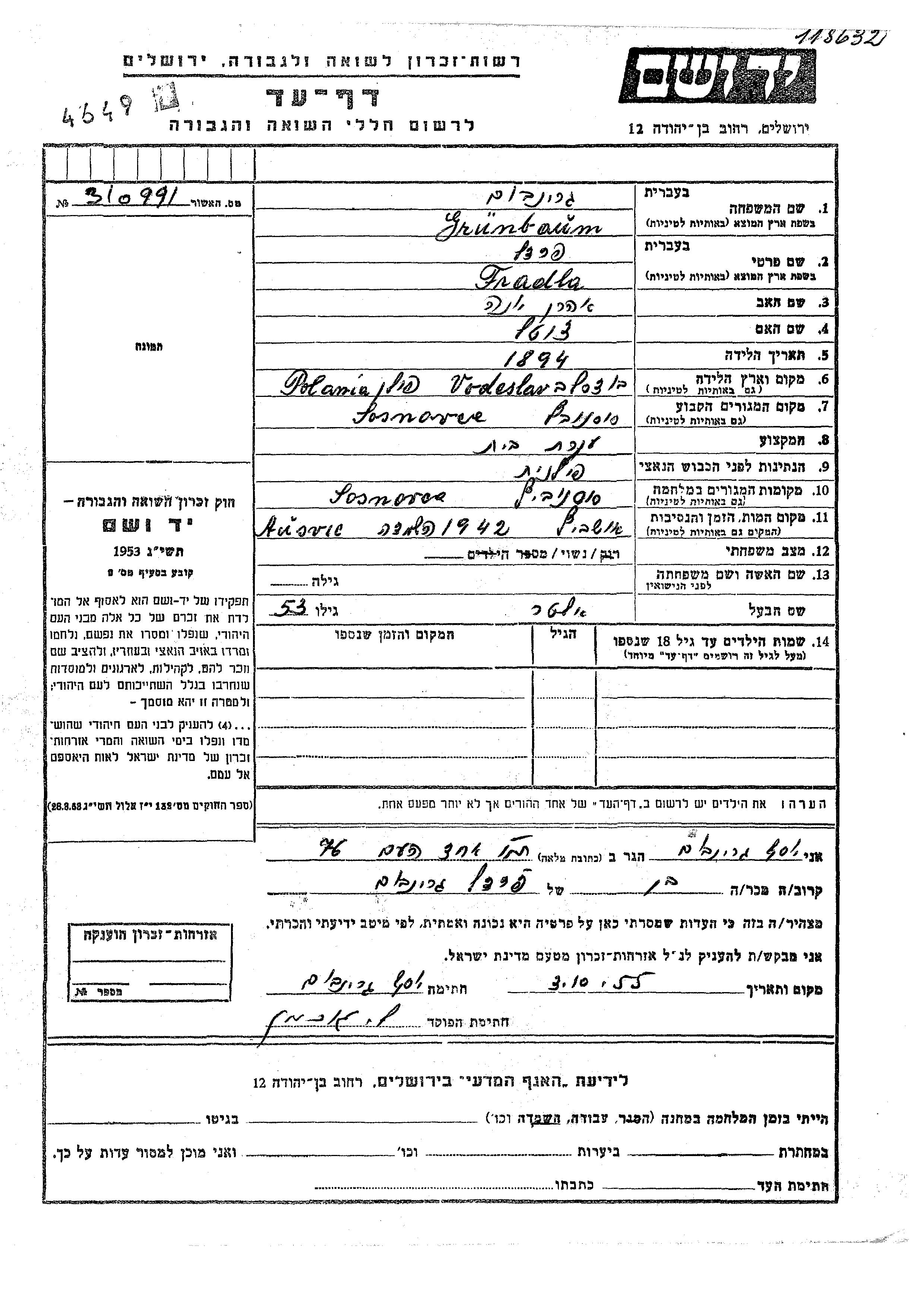 Fradla פרדלה גרונבאום גרינבום נולדה בVodeslav שבפולין בשנת 1894 לאהרן יונה וצוטל. היא היתה עקרת בית ונשואה לאלטר. לפני מלחמת העולם השניה התגוררה בSosnowce שבפולין. בזמן המלחמה היא היתה בSosnowce שבפולין. היא נרצחה בשואה. מקום המוות: Auschwitz שבפולין בשנת 1942.