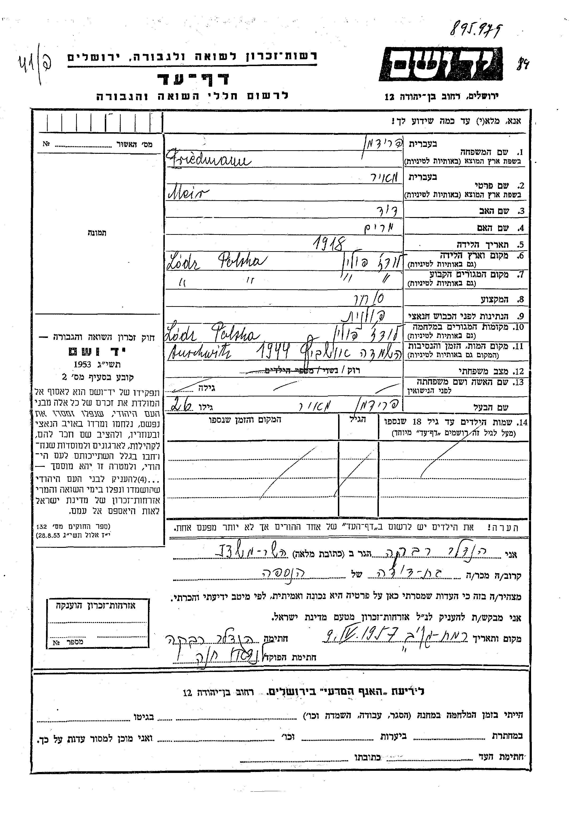 מאיר Friedmann נולד בLodz שבפולין בשנת 1918 לדוד ומרים. הוא היה סוחר ורווק. לפני מלחמת העולם השניה התגורר בLodz שבפולין. בזמן המלחמה הוא היה בLodz שבפולין. מאיר נרצח בשואה. מקום המוות: Auschwitz שבפולין בשנת 1944.