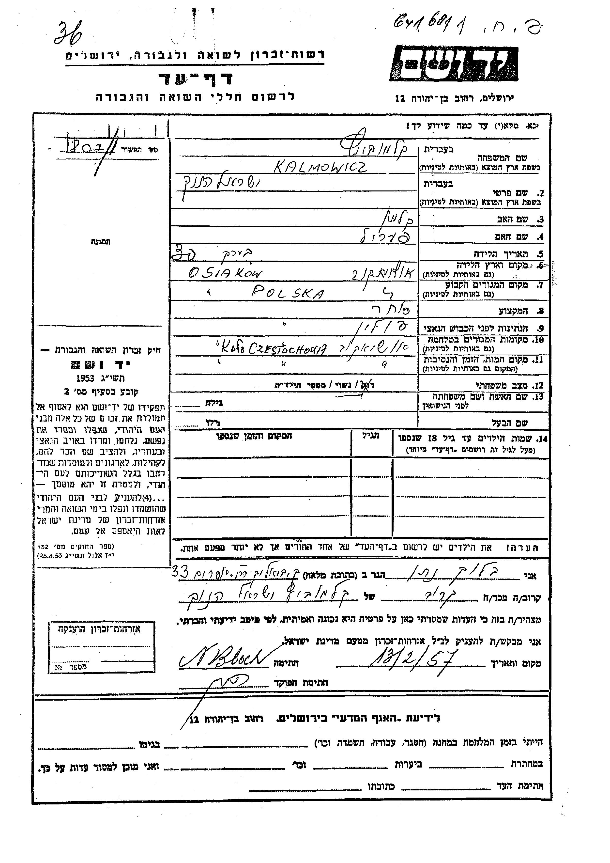 ישראל הניק Kalmowicz נולד בOsiakow שבפולין לקלמן ופעריל. הוא היה סוחר ונשוי. לפני מלחמת העולם השניה התגורר בOsiakow שבפולין. בזמן המלחמה הוא היה בCzestochowa שבפולין. ישראל הניק נרצח בשואה. מקום המוות: Czestochowa שבפולין.