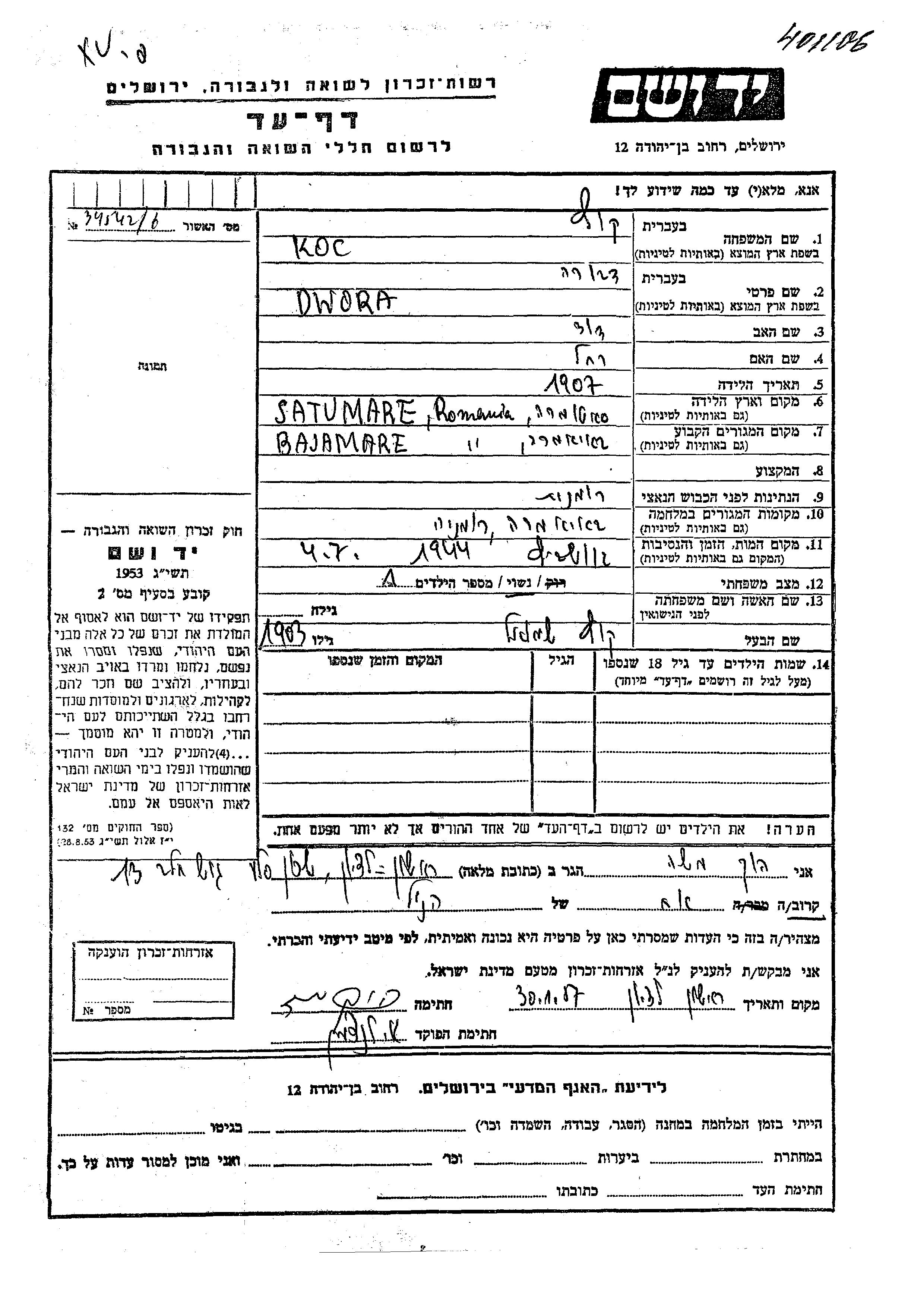 Dwora Koc נולדה בSatul Mare שברומניה בשנת 1907 לדוד ורחל. היא היתה נשואה לשמואל. לפני מלחמת העולם השניה התגוררה בBaia Mare שברומניה. בזמן המלחמה היא היתה בBaia Mare שברומניה. היא נרצחה בשואה. מקום המוות: Auschwitz שבפולין בשנת 1944.