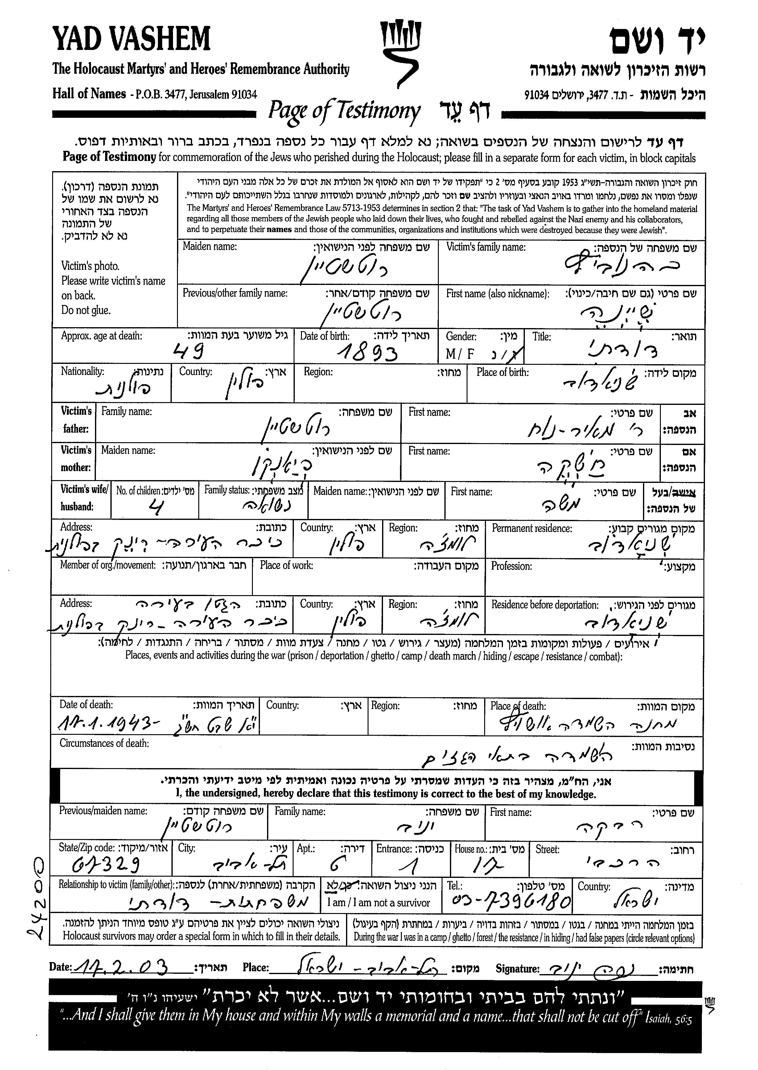 שיינה נרצחה בשואה. מקום המוות: Auschwitz שבפולין בשנת 17/01/1943.