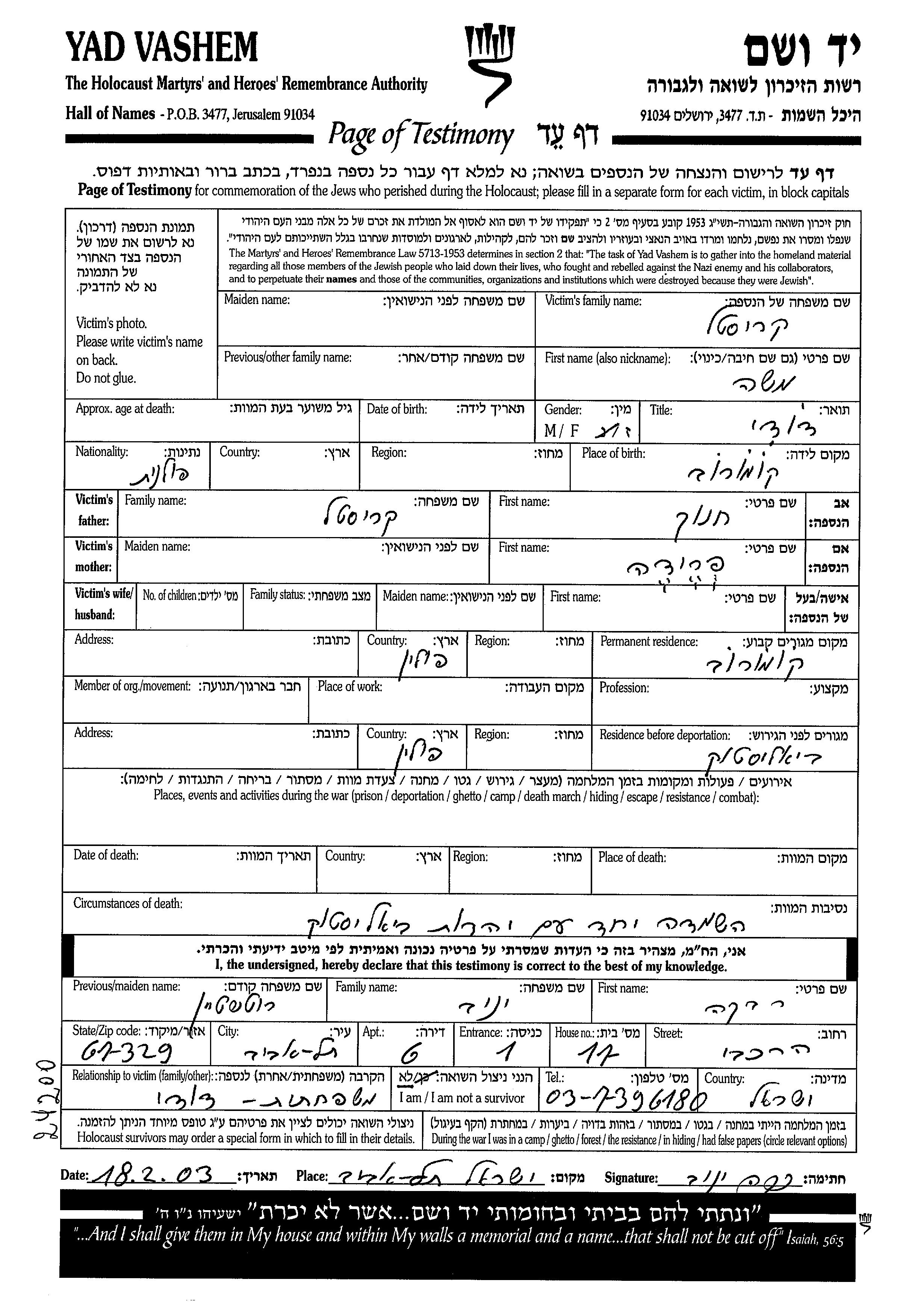 יד ושם - המפעל להנצחת השמות בדפי עד