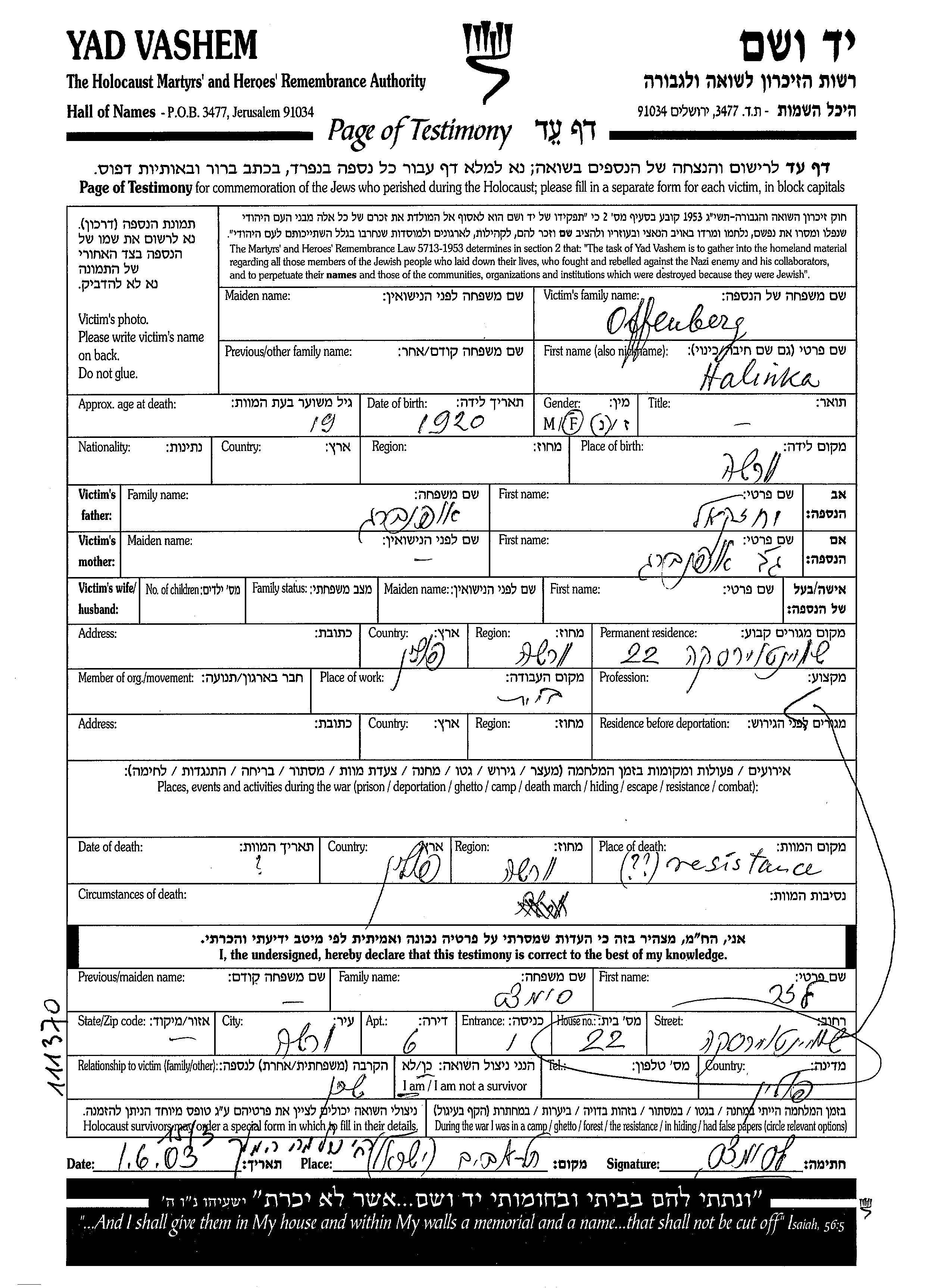 Halinka Offenberg נולדה בWarsaw שבפולין בשנת 1920 ליחזקאל. לפני מלחמת העולם השניה התגוררה בWarsaw שבפולין. בזמן המלחמה היא היתה בWarsaw שבפולין.
