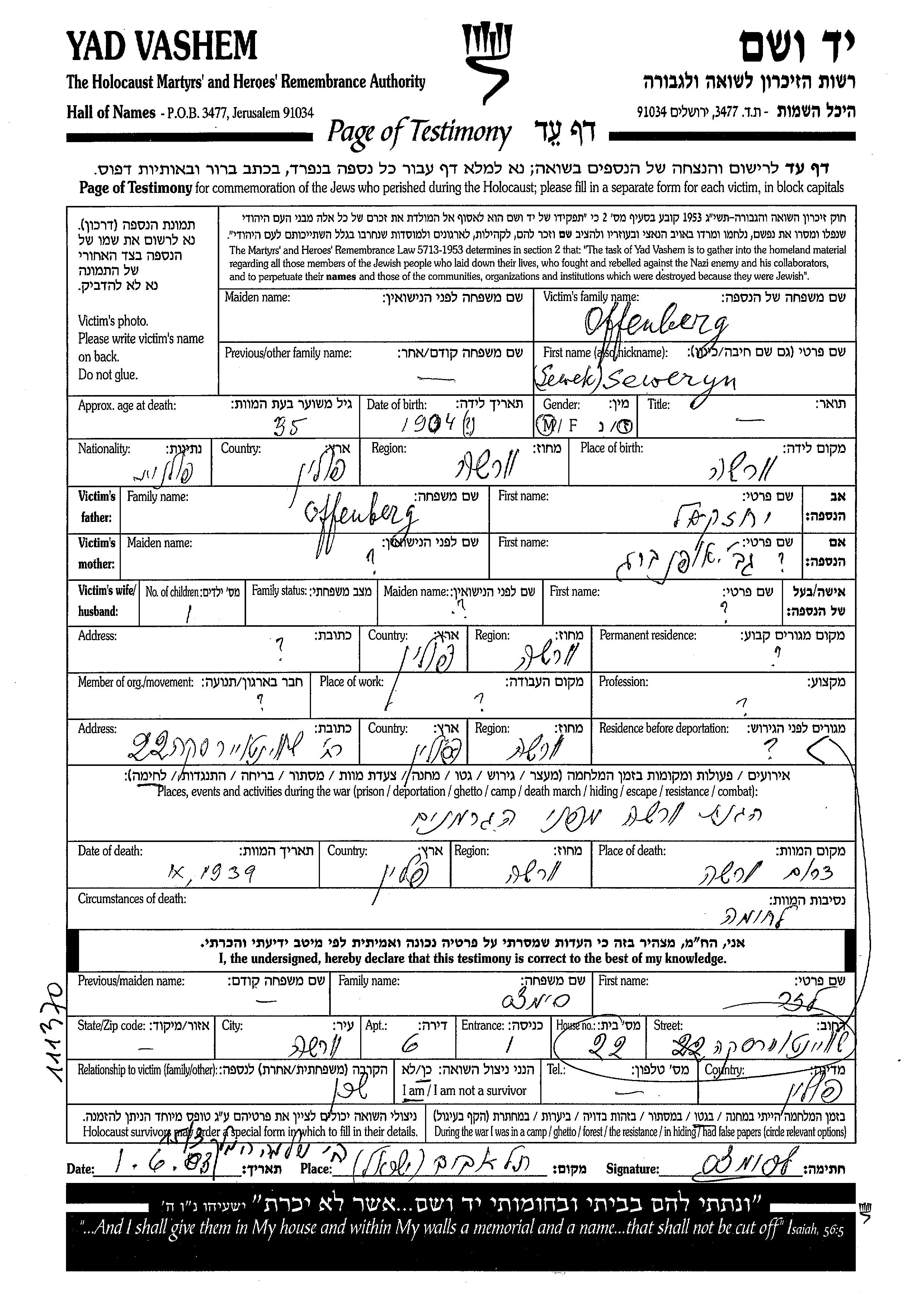 Offenberg Seweryn 1904 Warszawa, פולין דף-עד