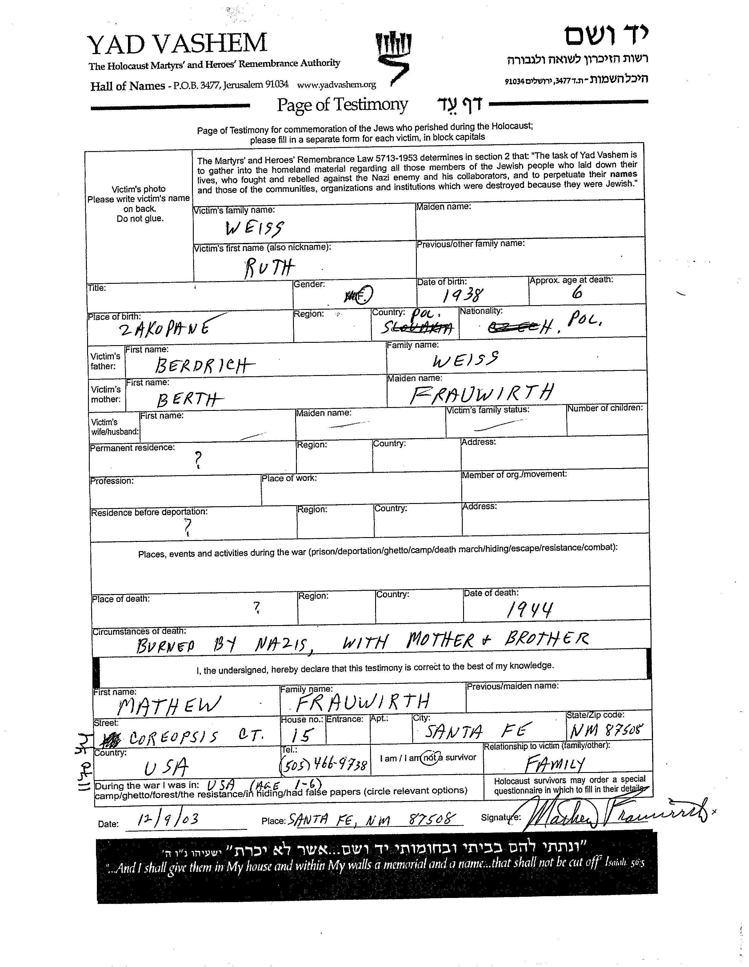 Ruth Weiss נולדה בZakopane שבפולין בשנת 1938 לBedrich וBerth לבית Frauwirth. היא היתה ילדה.