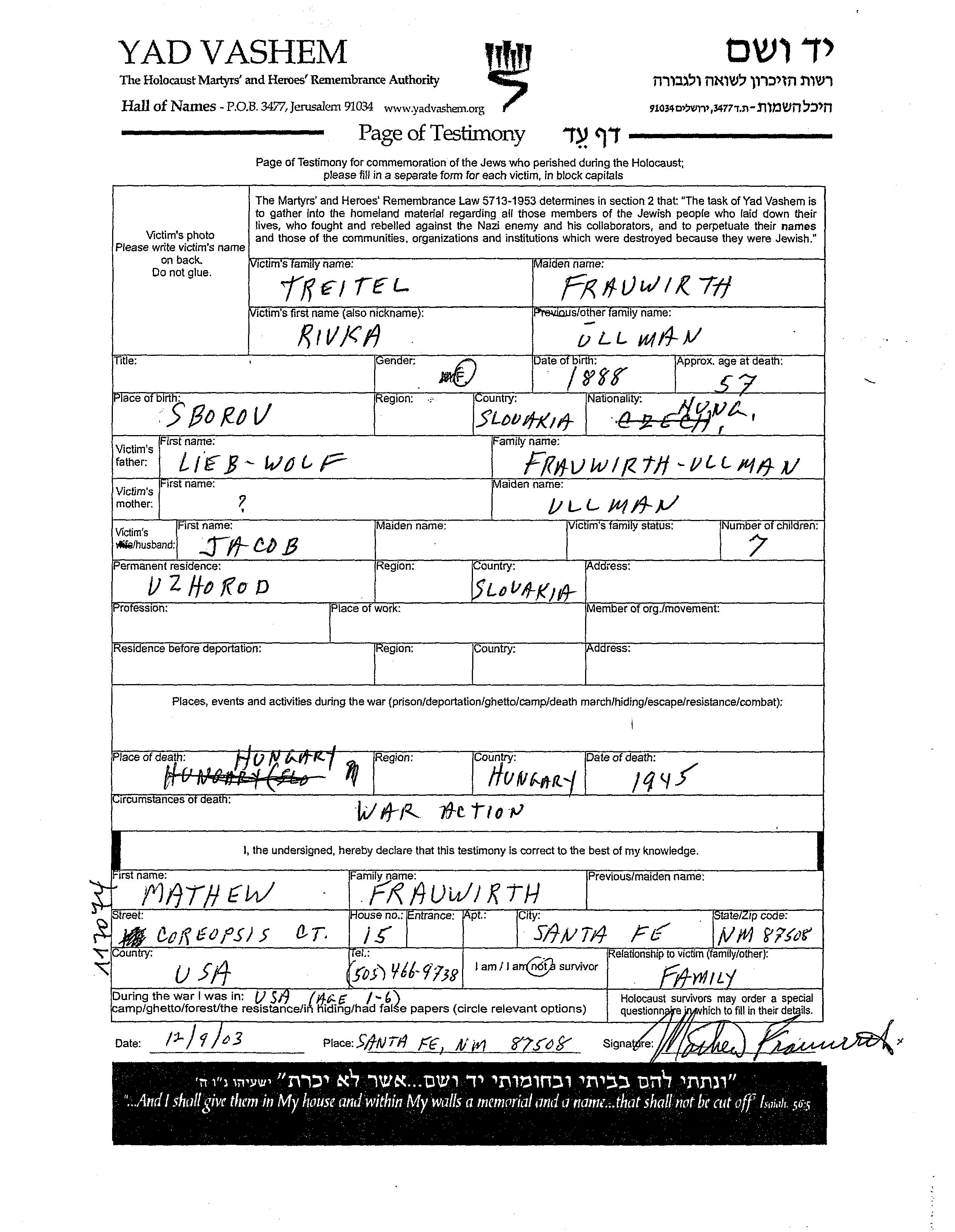 רבקה טרייטל לבית Frauwirth נולדה בZborov שבצ'כוסלובקיה בשנת 1888 לLieb Wolf לבית Ullman. היא היתה נשואה לJacob. לפני מלחמת העולם השניה התגוררה בUzhorod שבצ'כוסלובקיה.