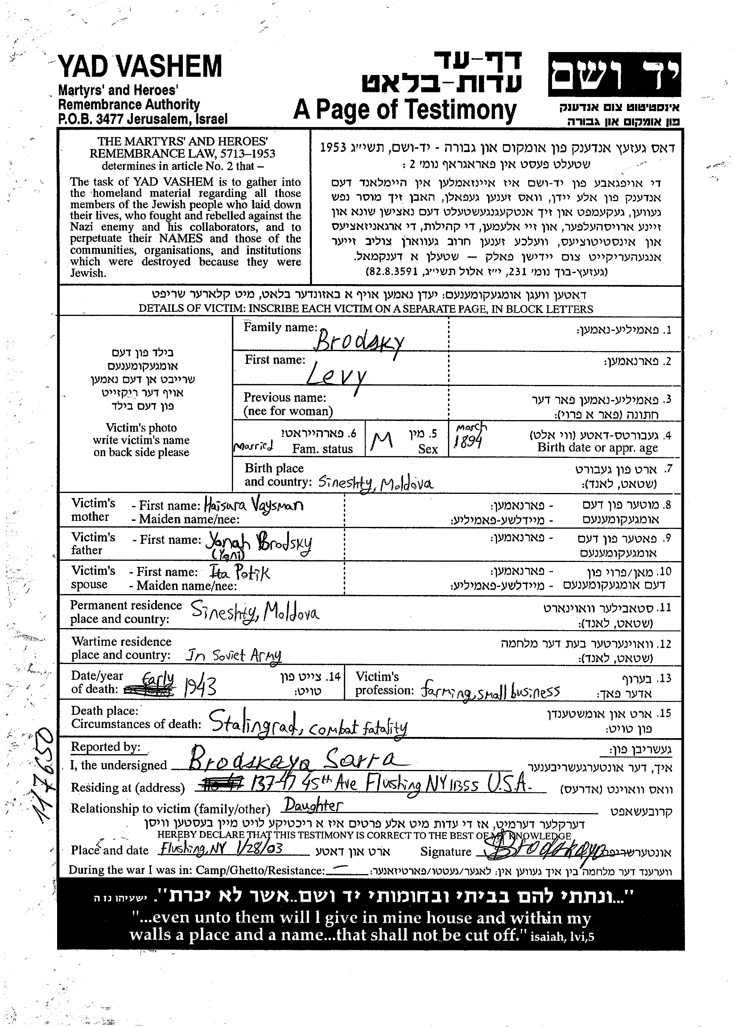 Levy Brodsky נולד בSineshty שברומניה בשנת 1894 לYonah וHaisura לבית Vaysman. הוא היה בעל משק ונשוי לIta לבית פוטיק. לפני מלחמת העולם השניה התגורר בSineshty שברומניה. בזמן המלחמה הוא היה בצבא הסובייטי. הוא נהרג בשירות צבאי. מקום המוות: Stalingrad שברוסיה (ברה"מ) בשנת 1943.