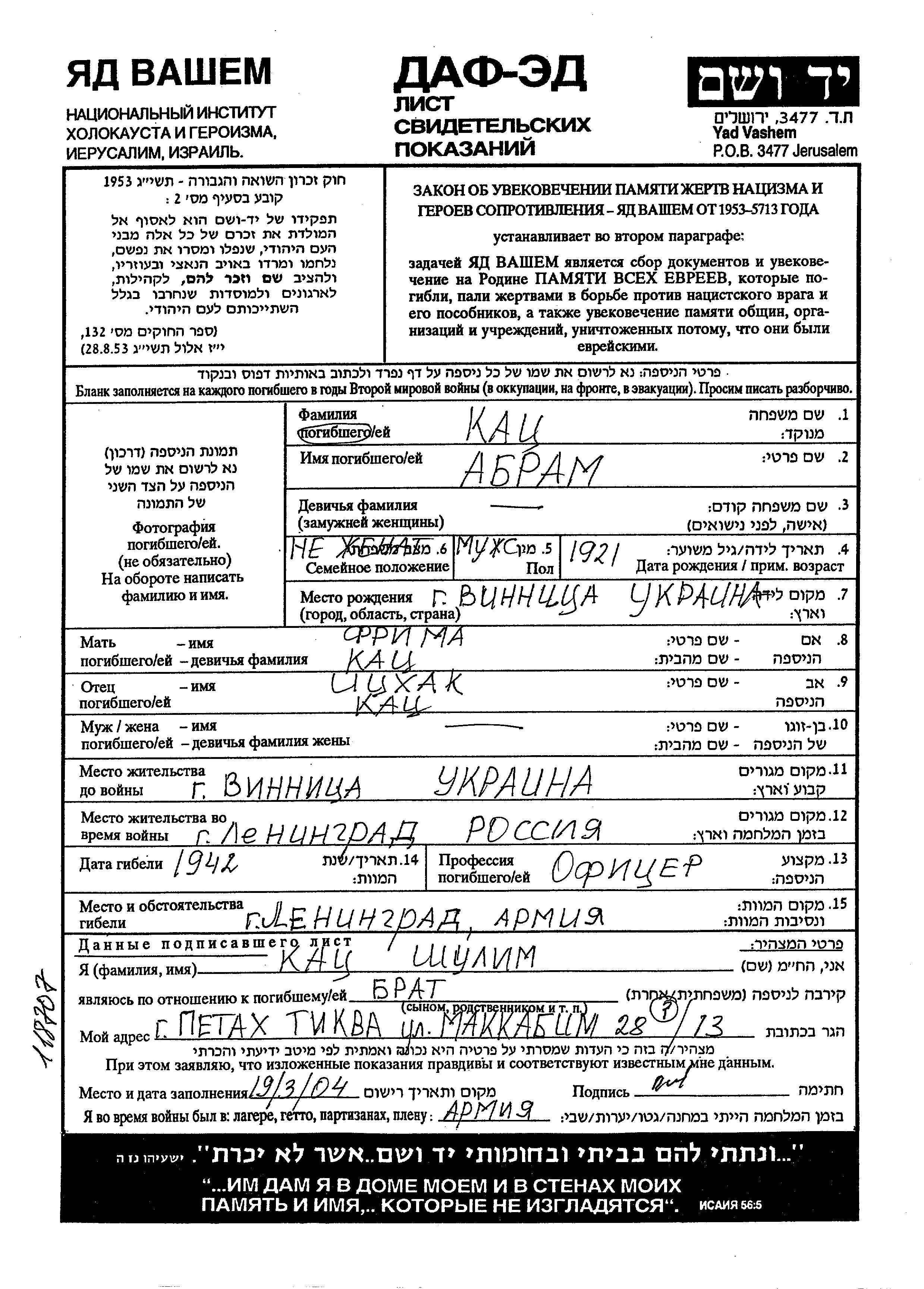 Abram כץ נולד בVinnitza שבאוקראינה (ברה"מ) בשנת 1921 לItzkhak וFrima. הוא היה קצין. לפני מלחמת העולם השניה התגורר בVinnitza שבאוקראינה (ברה"מ). בזמן המלחמה הוא היה בLeningrad שברוסיה (ברה"מ).
