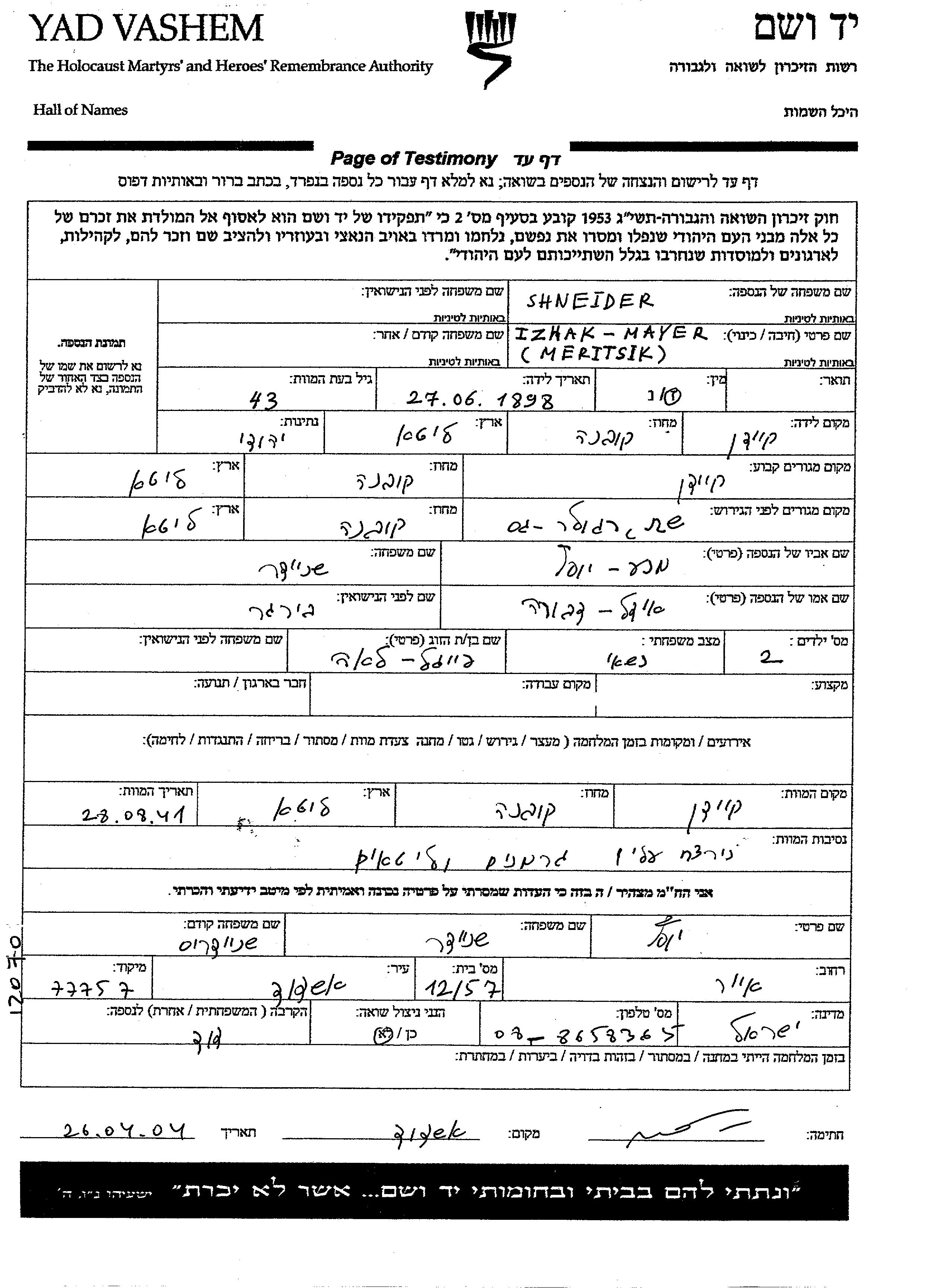 Izhak Meritsik שניידר נולד בKajdany שבליטא בשנת 1898 ליוסף מנע ודבורה איידל לבית בירגר. הוא היה נשוי לפייגל לאה. לפני מלחמת העולם השניה התגורר בKajdany שבליטא. בזמן המלחמה הוא היה בKajdany שבליטא. הוא נרצח בשואה. מקום המוות: Kajdany שבליטא בשנת 28/08/1941.