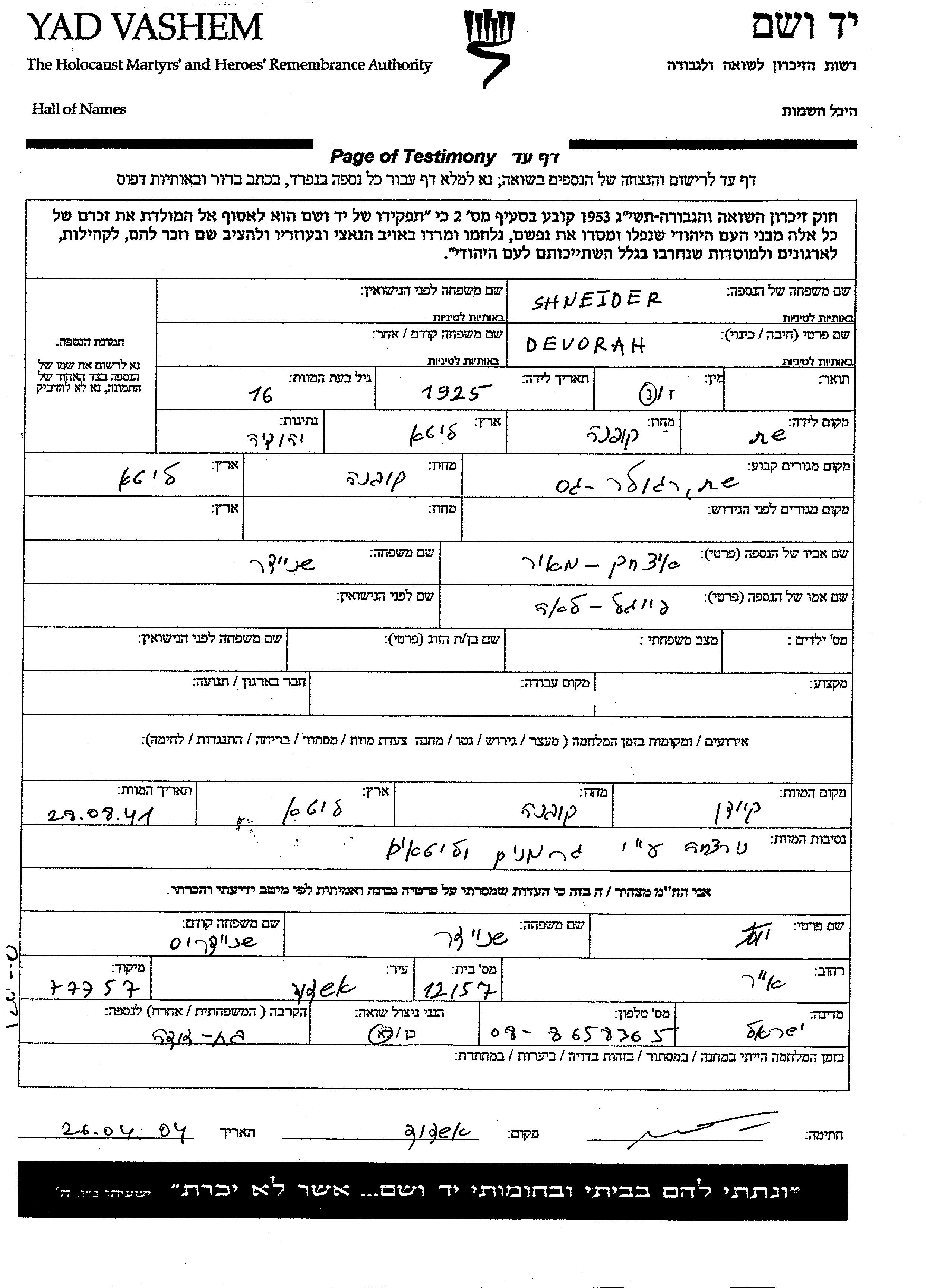 Devorah שניידר נולדה בShet שבליטא בשנת 1925 לאיצחק מאיר ופייגה לאה. לפני מלחמת העולם השניה התגוררה בShet שבליטא. היא נרצחה בשואה. מקום המוות: Kaidan שבליטא בשנת 28/08/1941.
