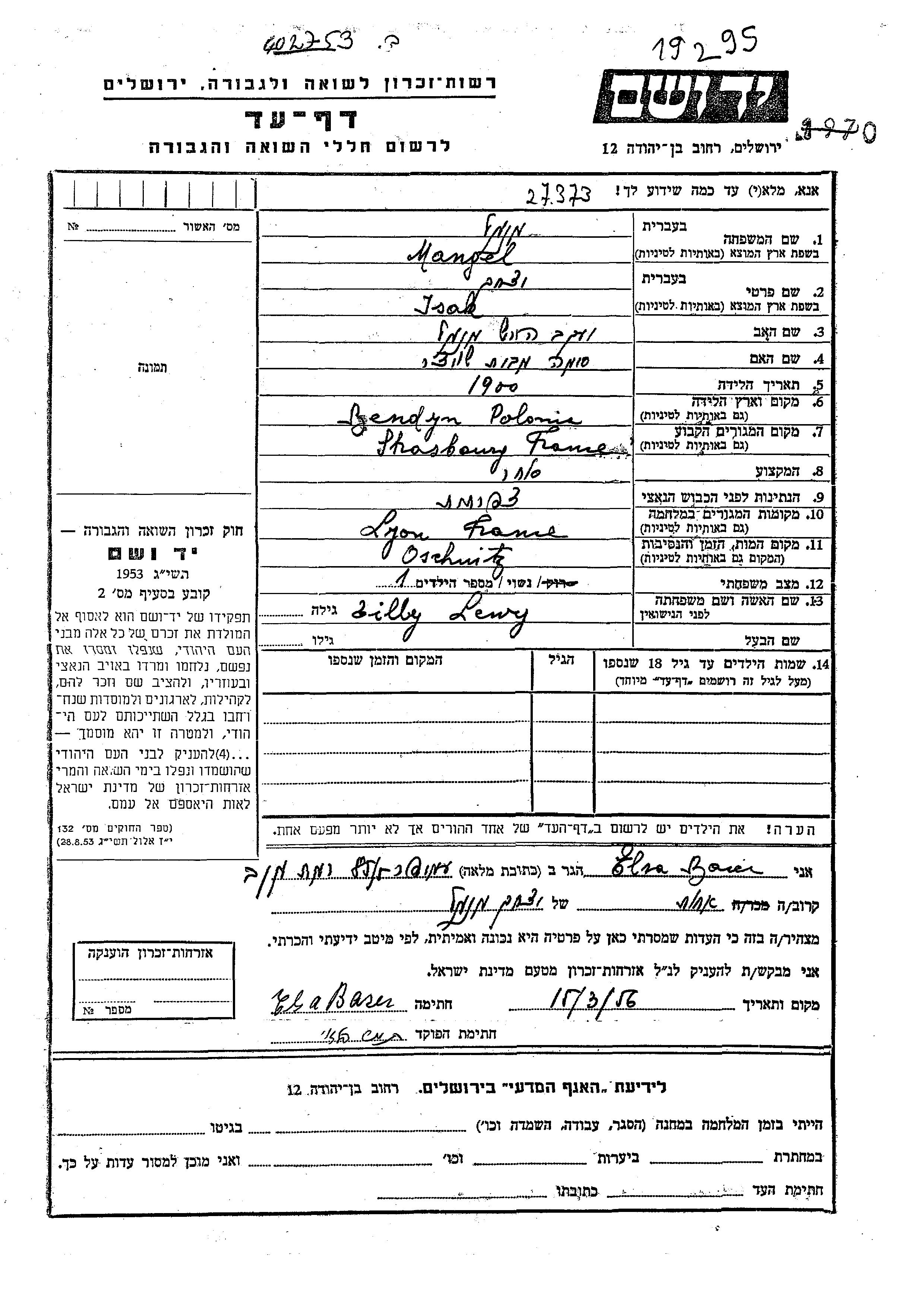יצחק מנגל נולד בBendzin שבפולין בשנת 1900 ליעקב וסימה. הוא היה סוחר ונשוי לLilly לבית Lewy. לפני מלחמת העולם השניה התגורר בStrasbourg שבצרפת. בזמן המלחמה הוא היה בLyon שבצרפת. יצחק נרצח בשואה. מקום המוות: Auschwitz שבפולין.
