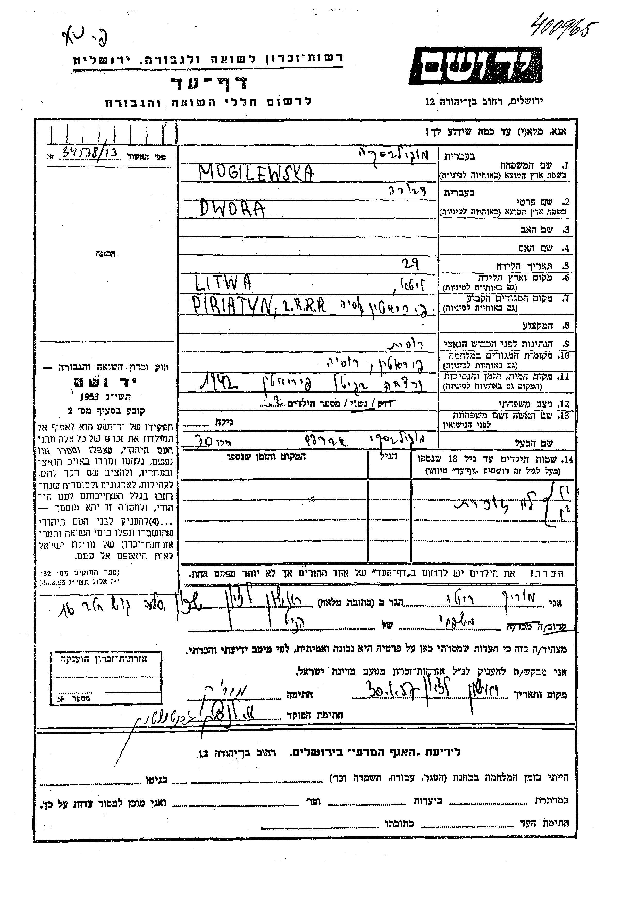 מוגילבסקה דבורה 1913 Piriatyn, אוקראינה (ברה"מ) דף-עד