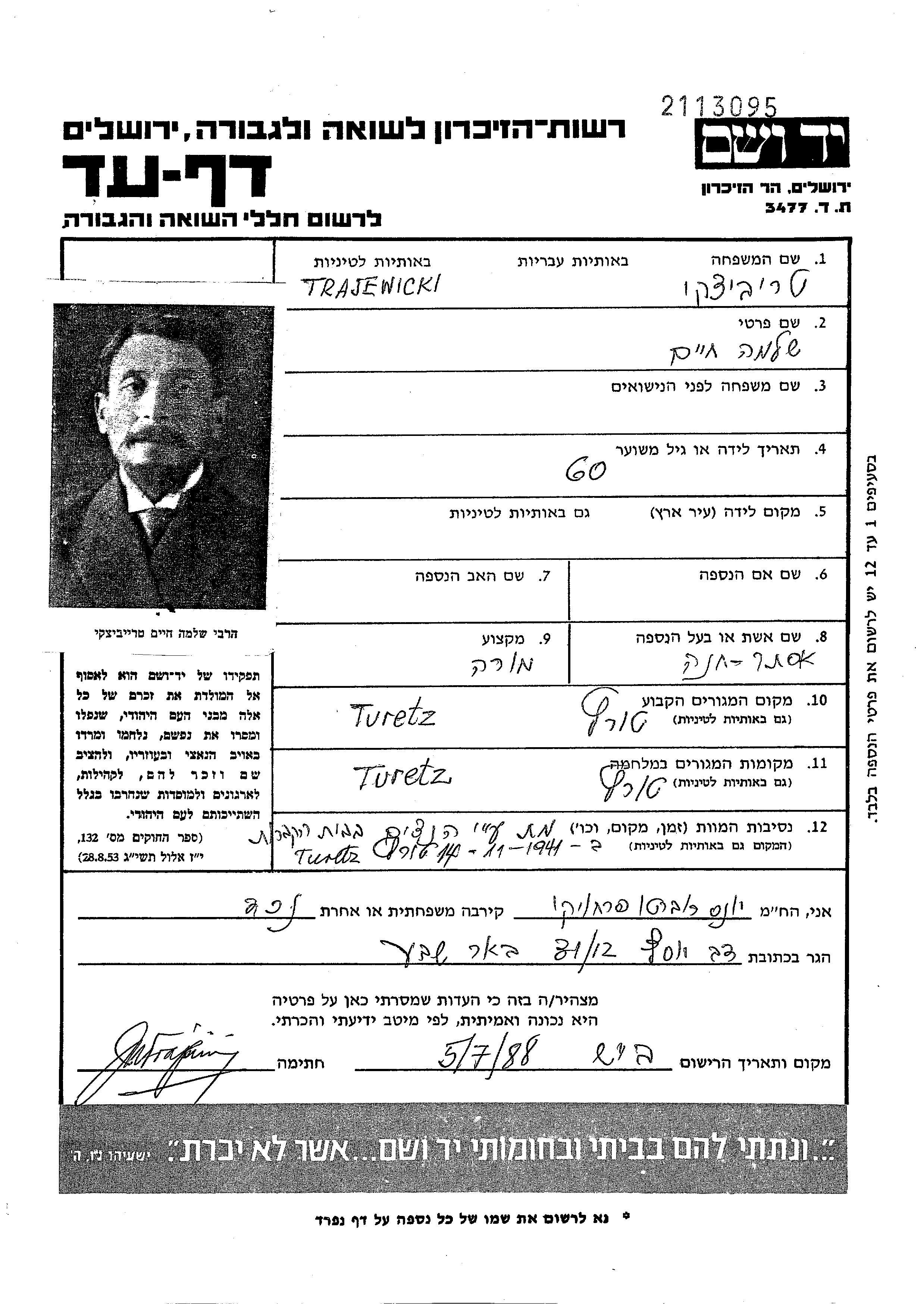 שלמה חיים Trajewicki נולד בשנת 1881. לפני מלחמת העולם השניה התגורר בTuretz שבפולין. בזמן המלחמה הוא היה בTuretz שבפולין. שלמה חיים נרצח בשואה. מקום המוות: Turetz שבפולין בשנת 14/11/1941.