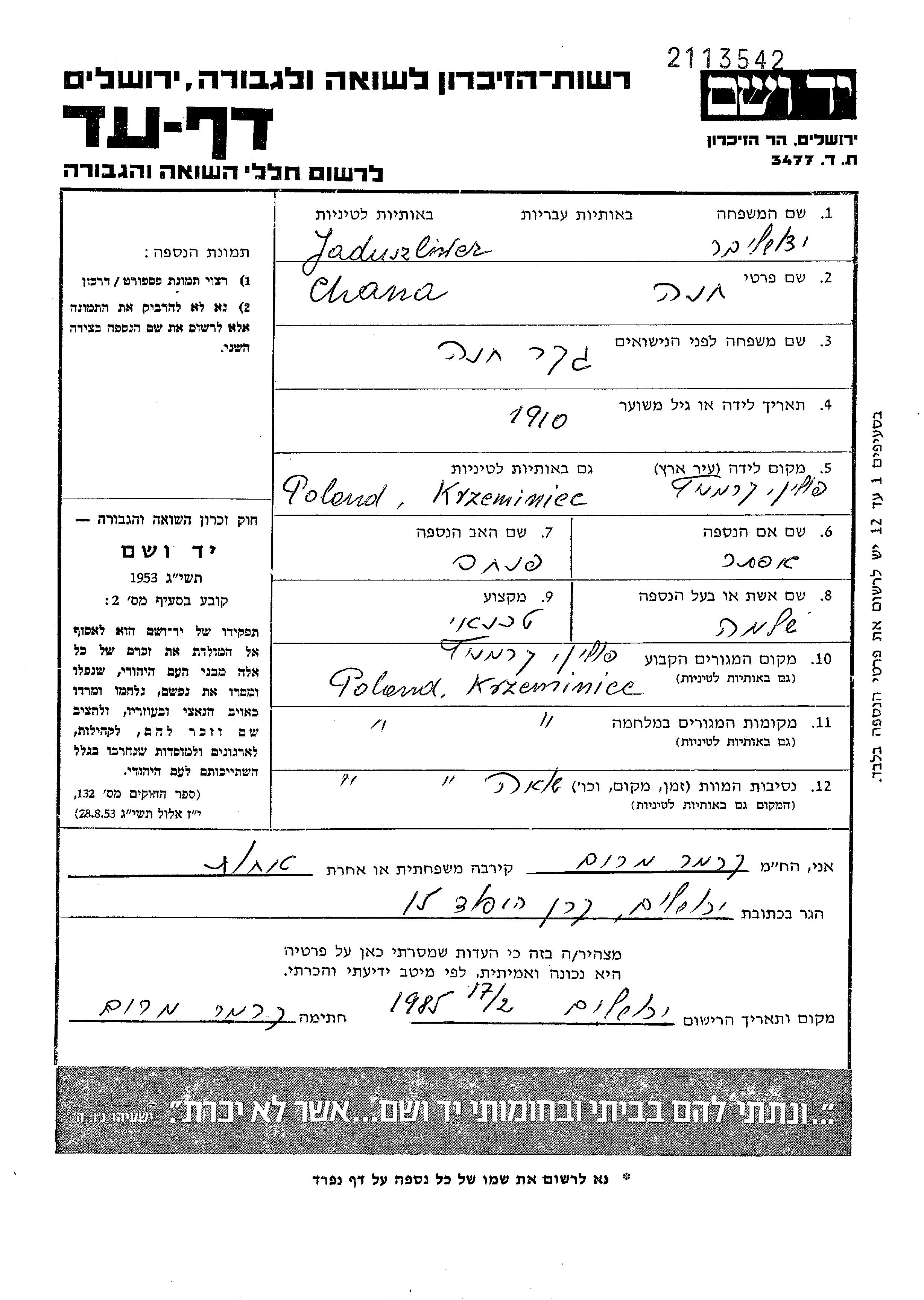 חנה Jaduszliwer לבית גקר נולדה בKrzemieniec שבפולין בשנת 1910 לפנחס ואסתר. היא היתה טכנאית ונשואה לשלמה. לפני מלחמת העולם השניה התגוררה בKrzemieniec שבפולין. בזמן המלחמה היא היתה בKrzemieniec שבפולין. חנה נרצחה בשואה. מקום המוות: Krzemieniec שבפולין.