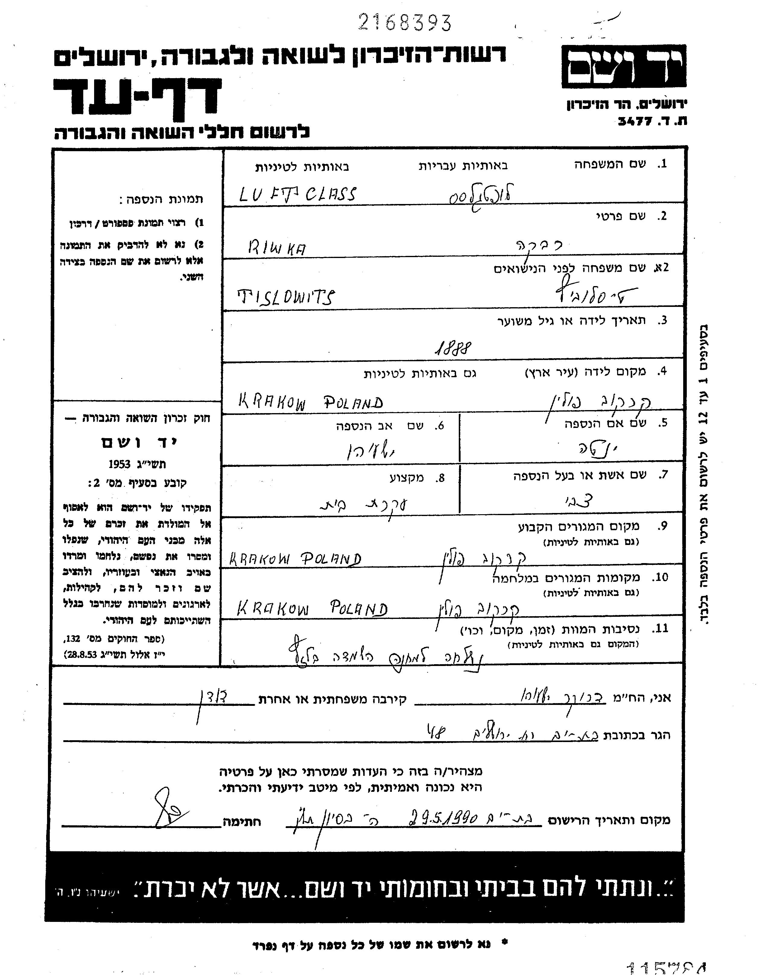 רבקה נרצחה בשואה. מקום המוות: Belzec שבפולין.