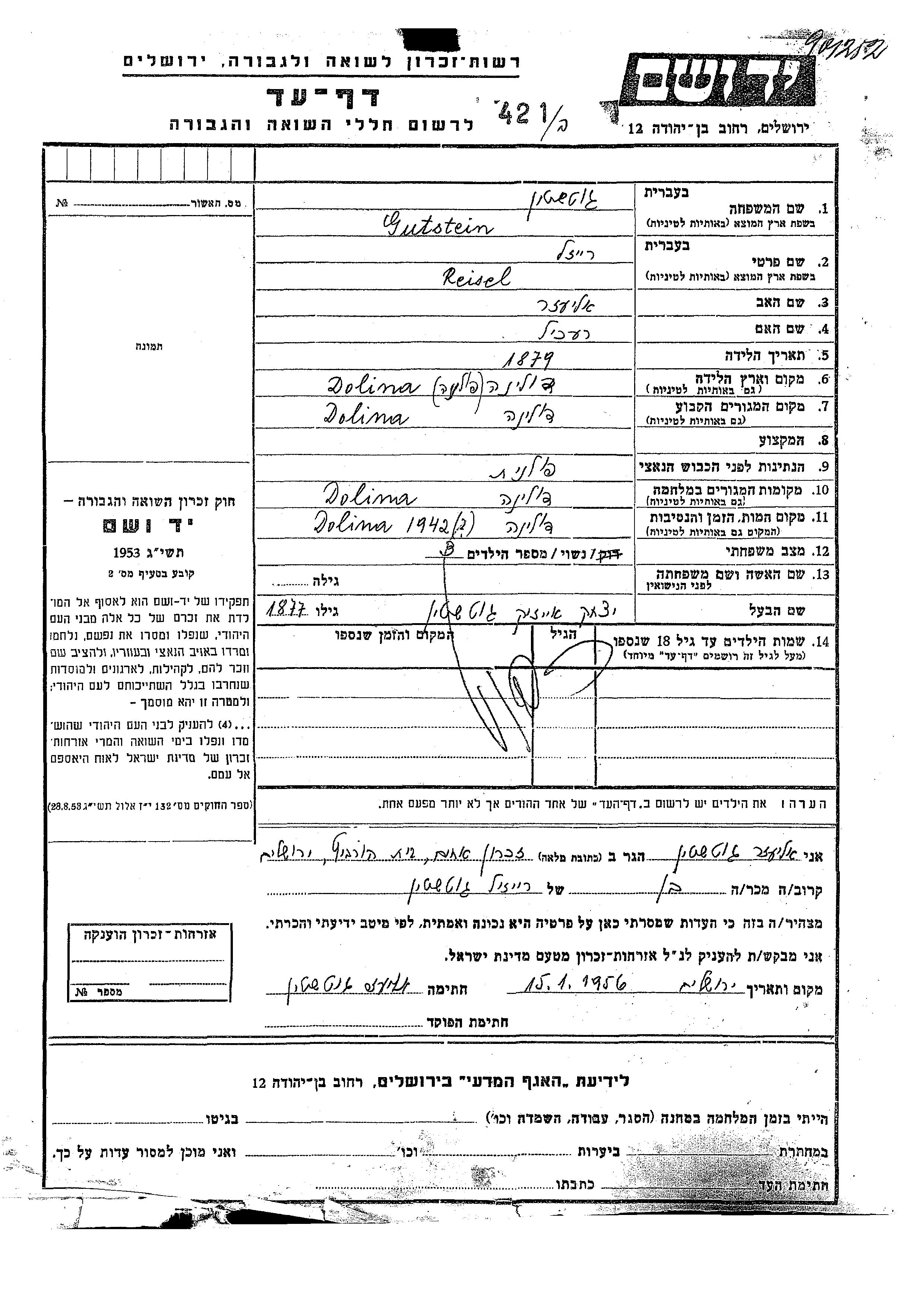 Reisel Gutstein נולדה בDolina שבפולין בשנת 1879 לאליעזר ורעכיל. היא היתה נשואה ליצחק. לפני מלחמת העולם השניה התגוררה בDolina שבפולין. בזמן המלחמה היא היתה בDolina שבפולין.