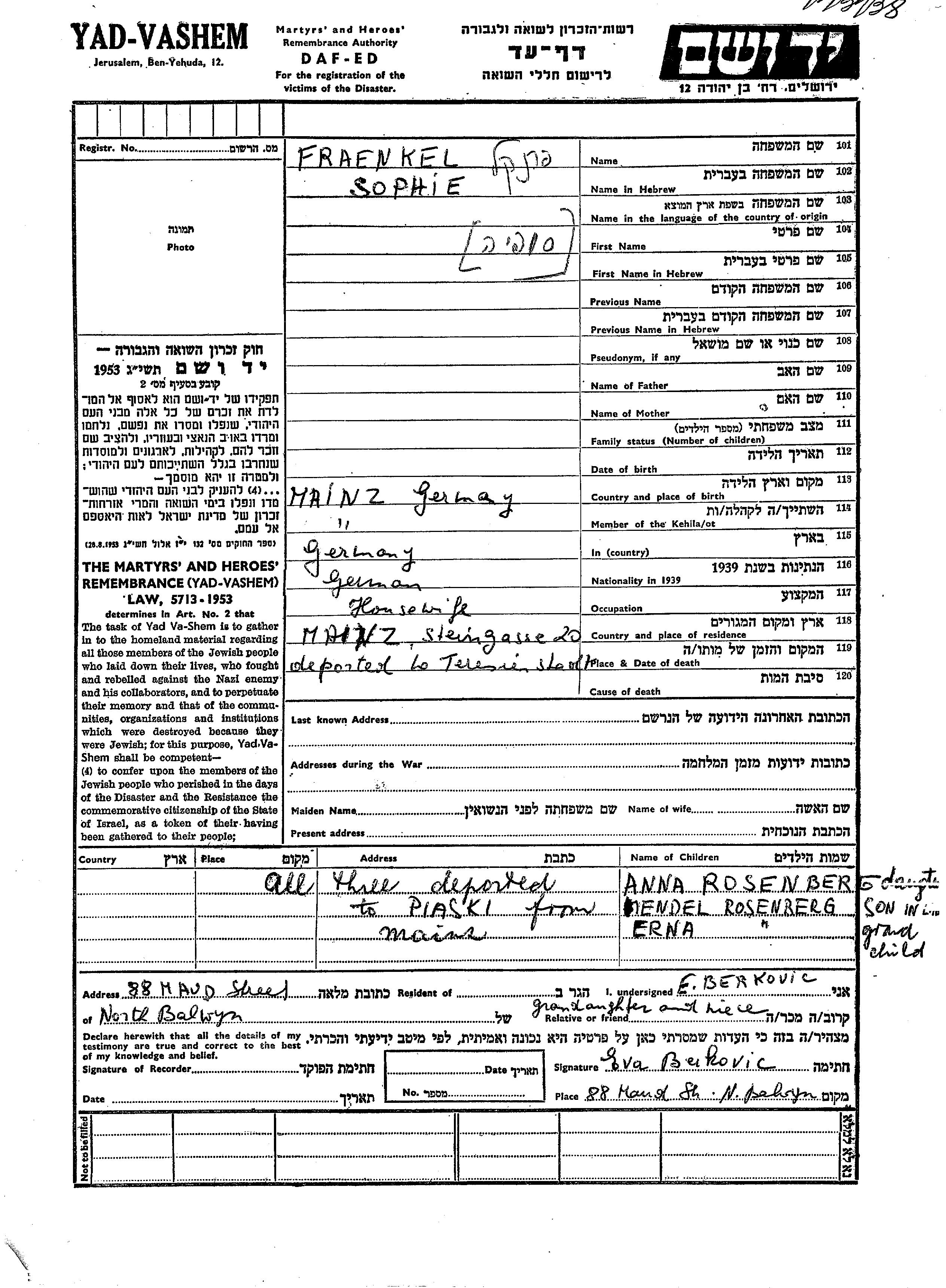 Sophie Fraenkel נולדה בMainz שבגרמניה. היא היתה עקרת בית. לפני מלחמת העולם השניה התגוררה בMainz שבגרמניה. בזמן המלחמה היא היתה בMainz שבגרמניה. היא נרצחה בשואה. מקום המוות: Theresienstadt שבצ'כוסלובקיה.