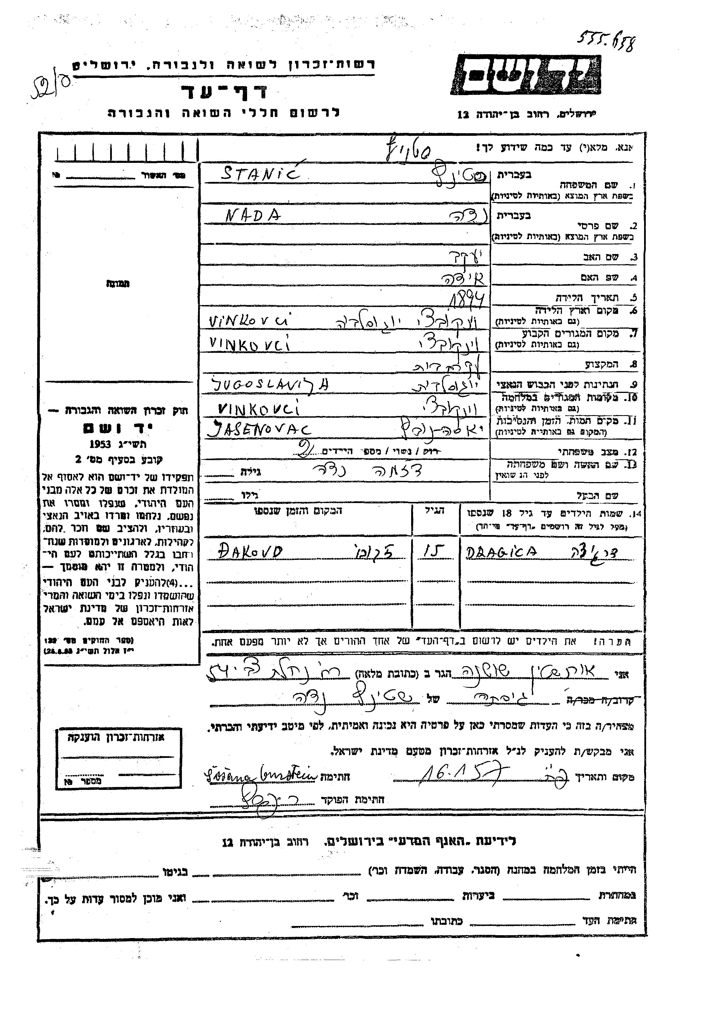 נדה נרצחה בשואה. מקום המוות: Jasenovac שביוגוסלביה.