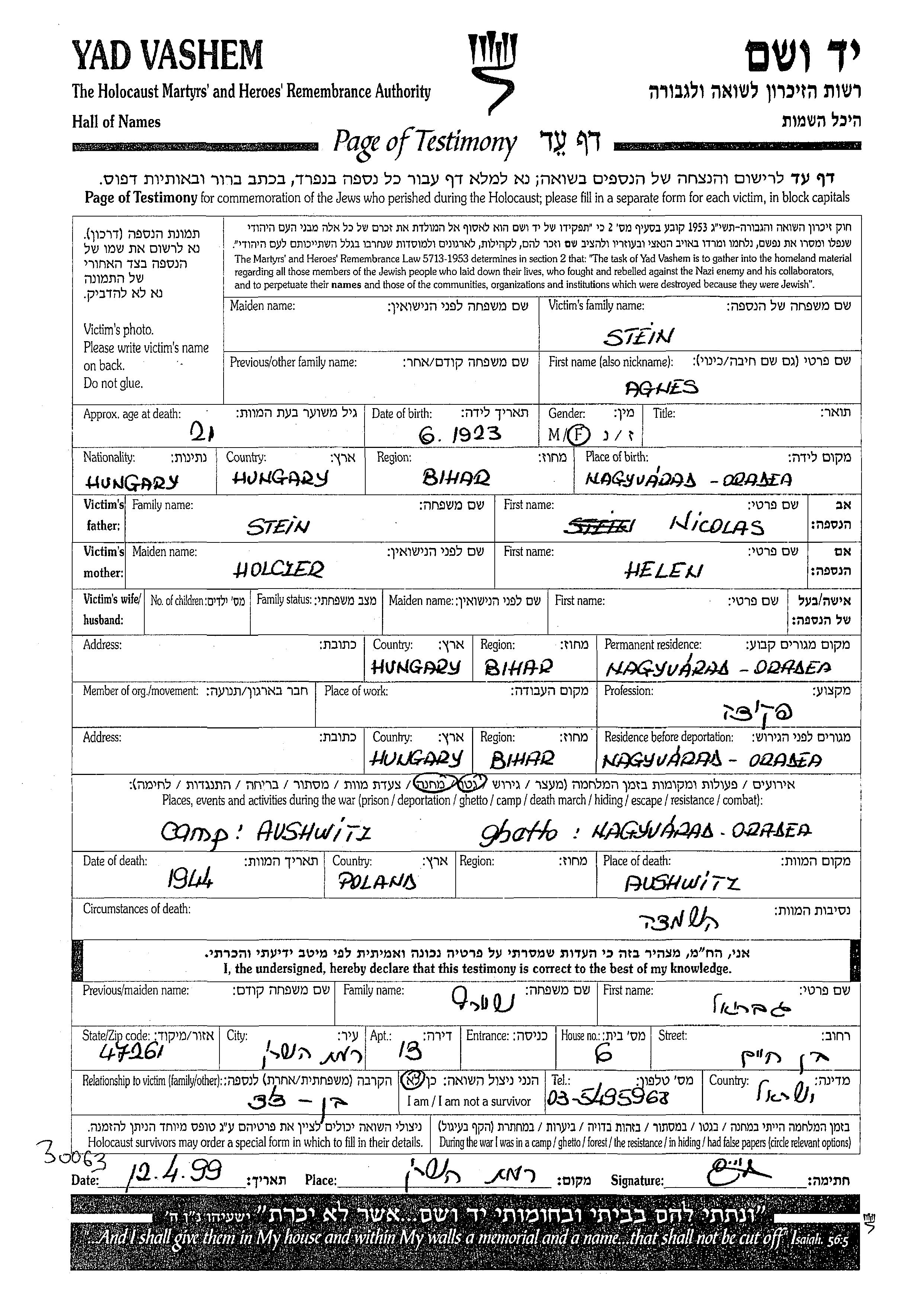 אגנס Stein נולדה בNagyvarad שברומניה בשנת 1923 לNicolas והלן לבית Holczer. היא היתה פקידה. לפני מלחמת העולם השניה התגוררה בNagyvarad שברומניה. בזמן המלחמה היא היתה בNagyvarad שברומניה.