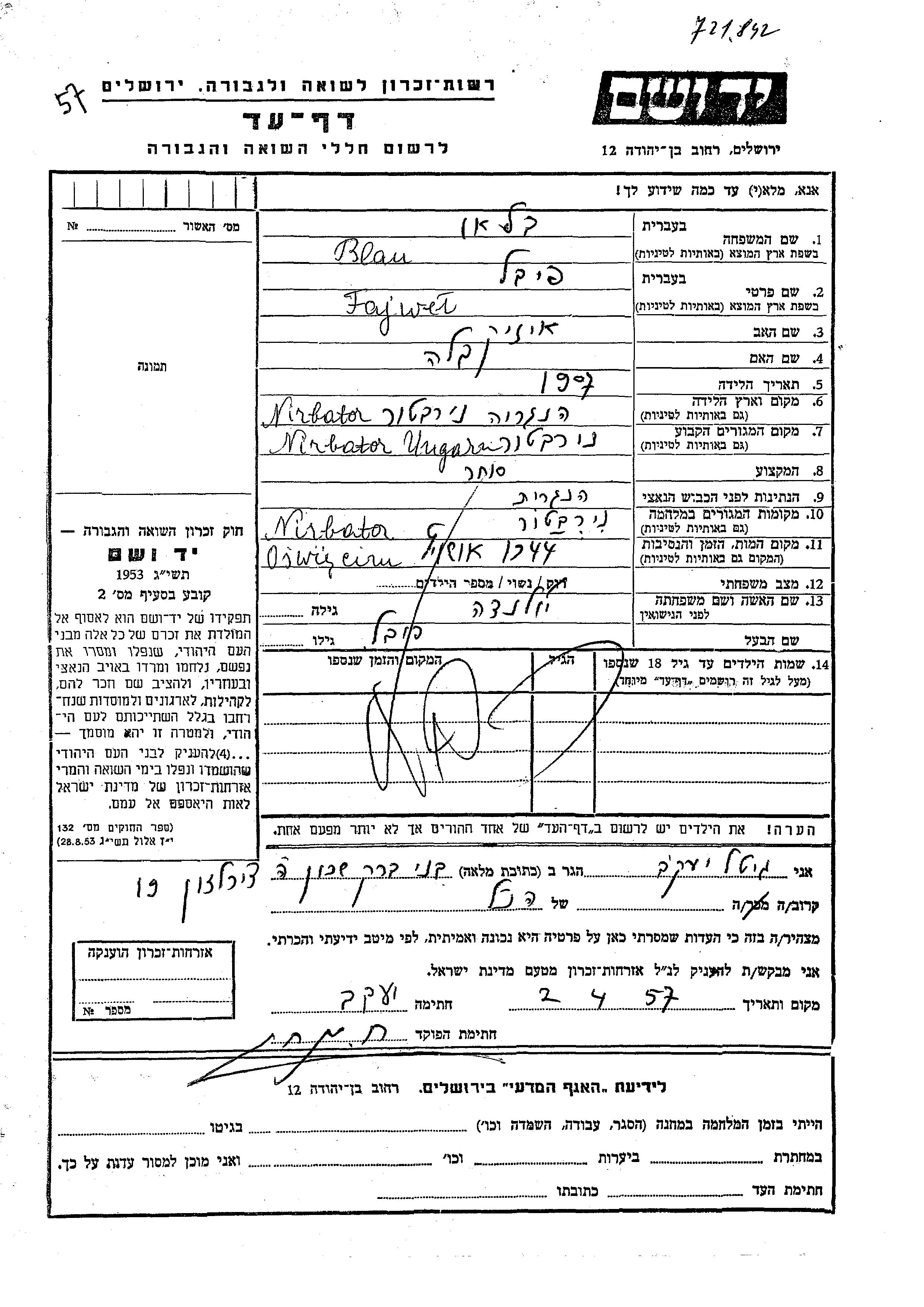 Fajwel בלאו נולד בNirbator שבהונגריה בשנת 1907 לאיזיק ובלה. הוא היה סוחר ונשוי ליולנדה. לפני מלחמת העולם השניה התגורר בNirbator שבהונגריה. בזמן המלחמה הוא היה בNirbator שבהונגריה.