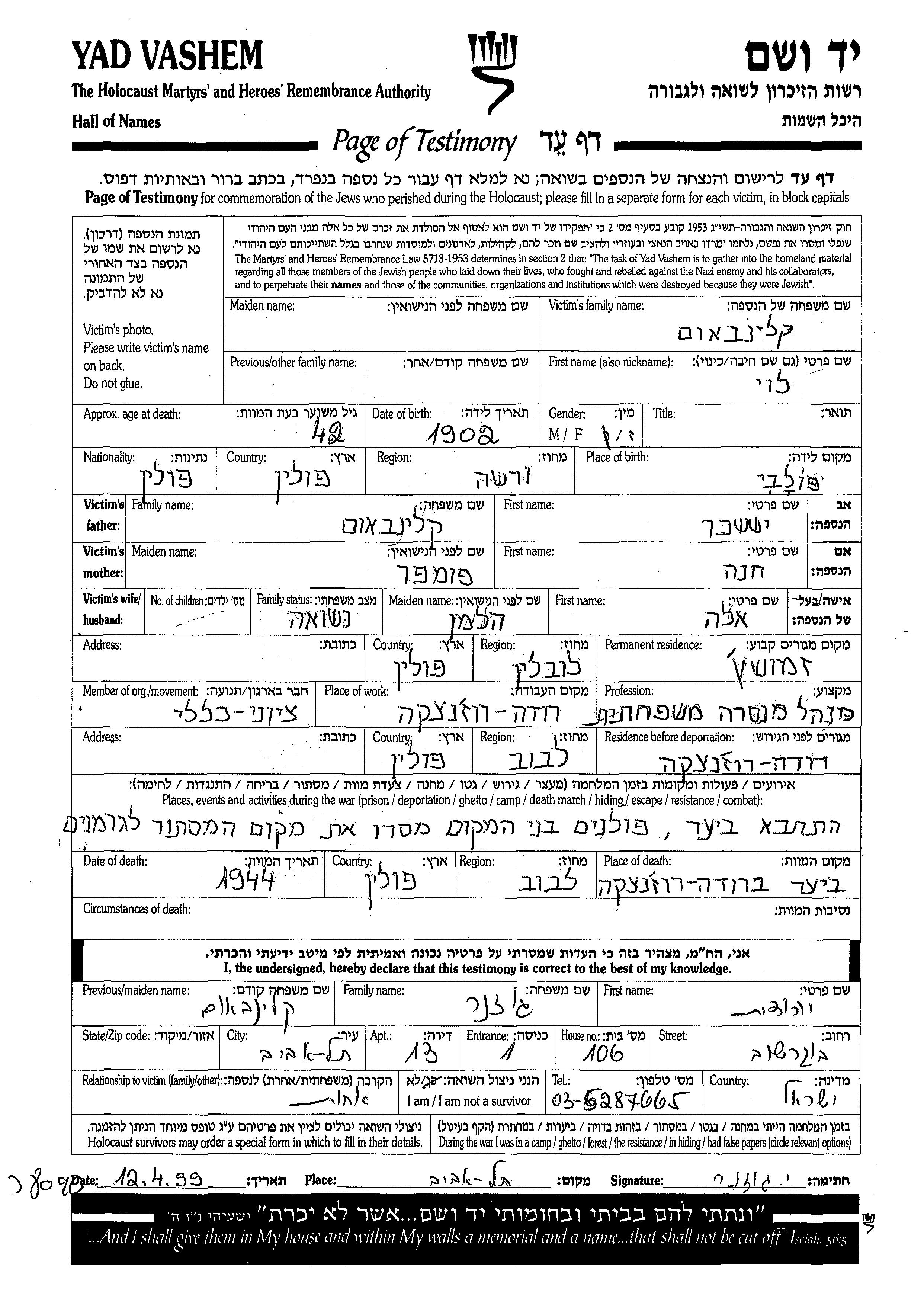 לוי קלינבאום נולד בPulawy שבפולין בשנת 1902 ליששכר וחנה לבית פומפר. הוא היה מנהל מנסרה ונשוי לאלה לבית הלמן. לפני מלחמת העולם השניה התגורר בZamosz שבפולין. בזמן המלחמה הוא היה בRuda Rozaniecka שבפולין. לוי נרצח בשואה. מקום המוות: Ruda Rozaniecka שבפולין בשנת 1944.
