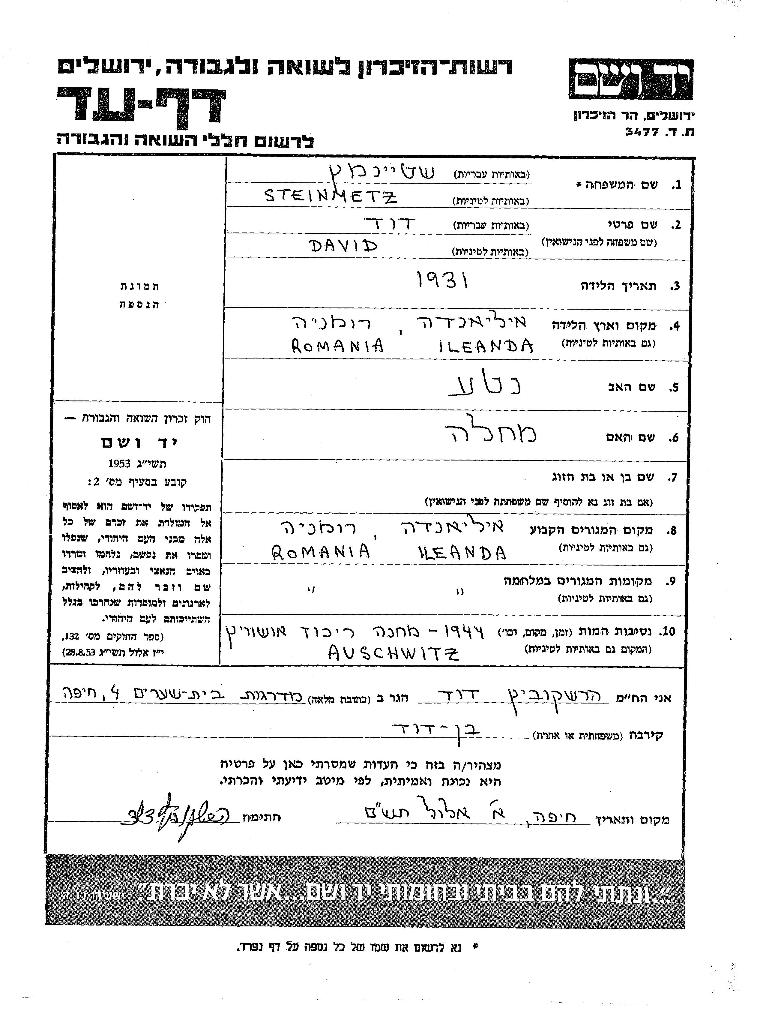 דוד Steinmetz נולד בIleanda שברומניה בשנת 1931 לנטע ומחלה. לפני מלחמת העולם השניה התגורר בIleanda שברומניה. בזמן המלחמה הוא היה בIleanda שברומניה. דוד נרצח בשואה. מקום המוות: Auschwitz שבפולין בשנת 1944.