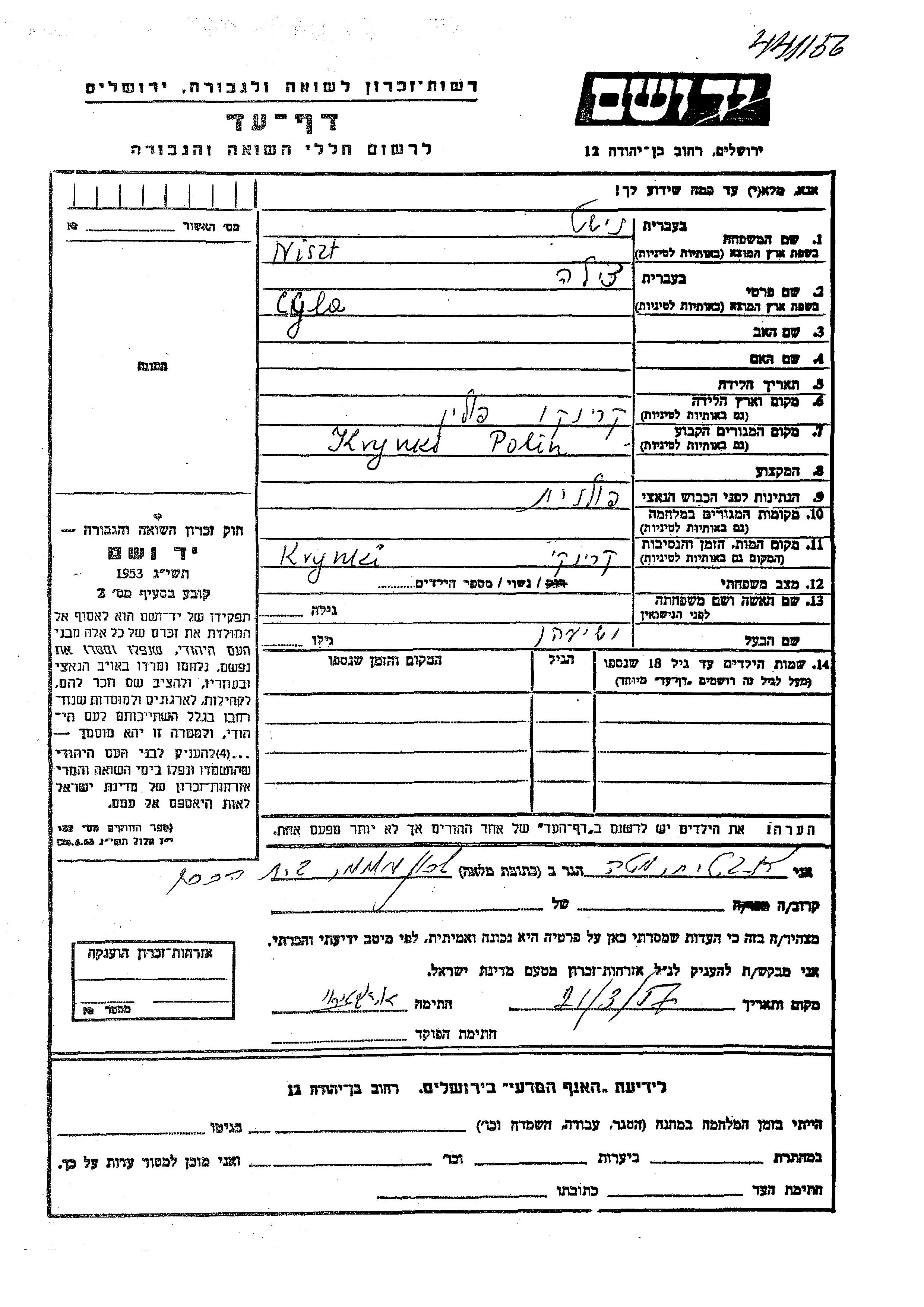 Cyla Niszt נולדה בKrynica שבפולין. היא היתה נשואה לישיעהו. לפני מלחמת העולם השניה התגוררה בKrynica שבפולין.