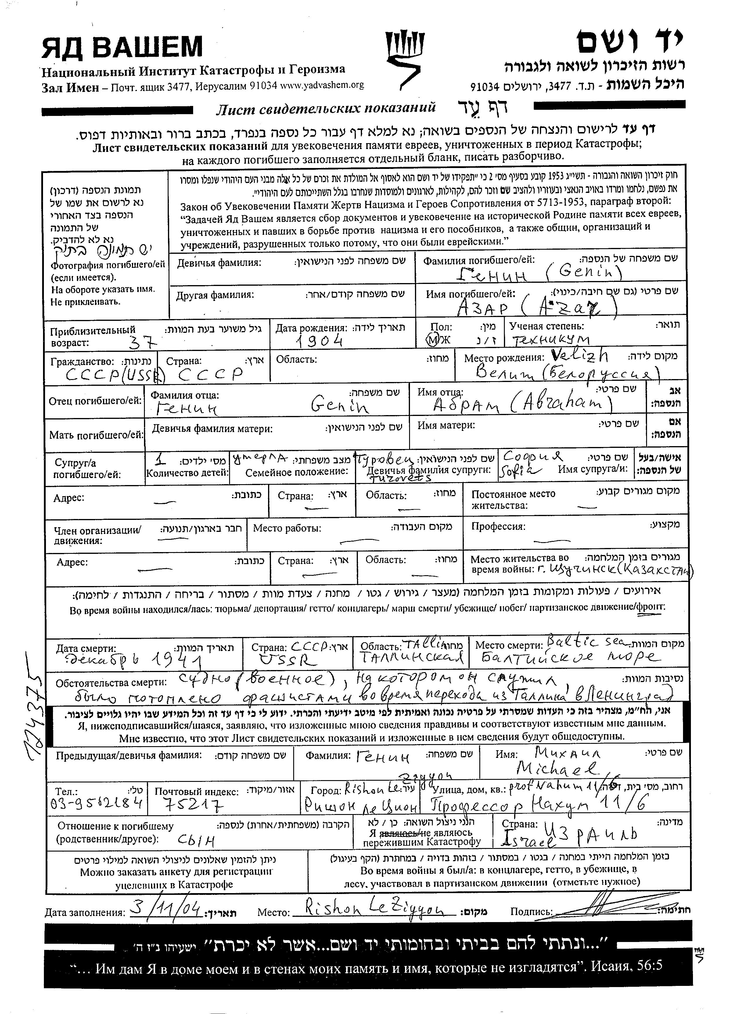Azar גנין נולד בVelizh שברוסיה (ברה"מ) בשנת 1904 לAbraham. הוא היה נשוי לסופיה לבית טורובץ. בזמן המלחמה הוא היה בShchuchinsk שבקזחסטן (ברה"מ). הוא נרצח בשואה. מקום המוות: Baltic Sea בשנת 12/1941.