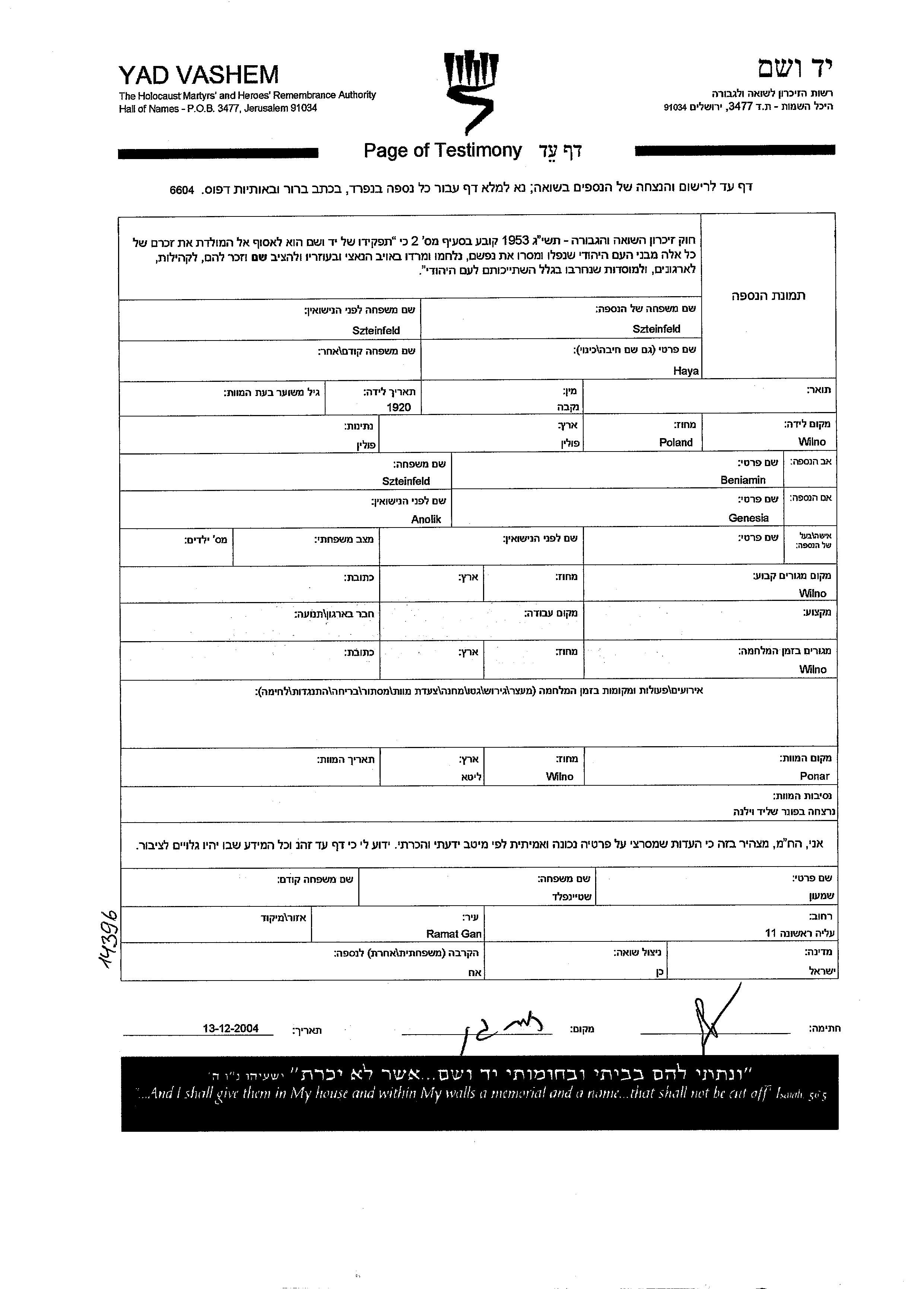 Haya Szteinfeld לבית Szteinfeld נולדה בWilno שבפולין בשנת 1920 לבנימין וGenesia לבית אנוליק. לפני מלחמת העולם השניה התגוררה בWilno שבפולין. בזמן המלחמה היא היתה בWilno שבפולין.