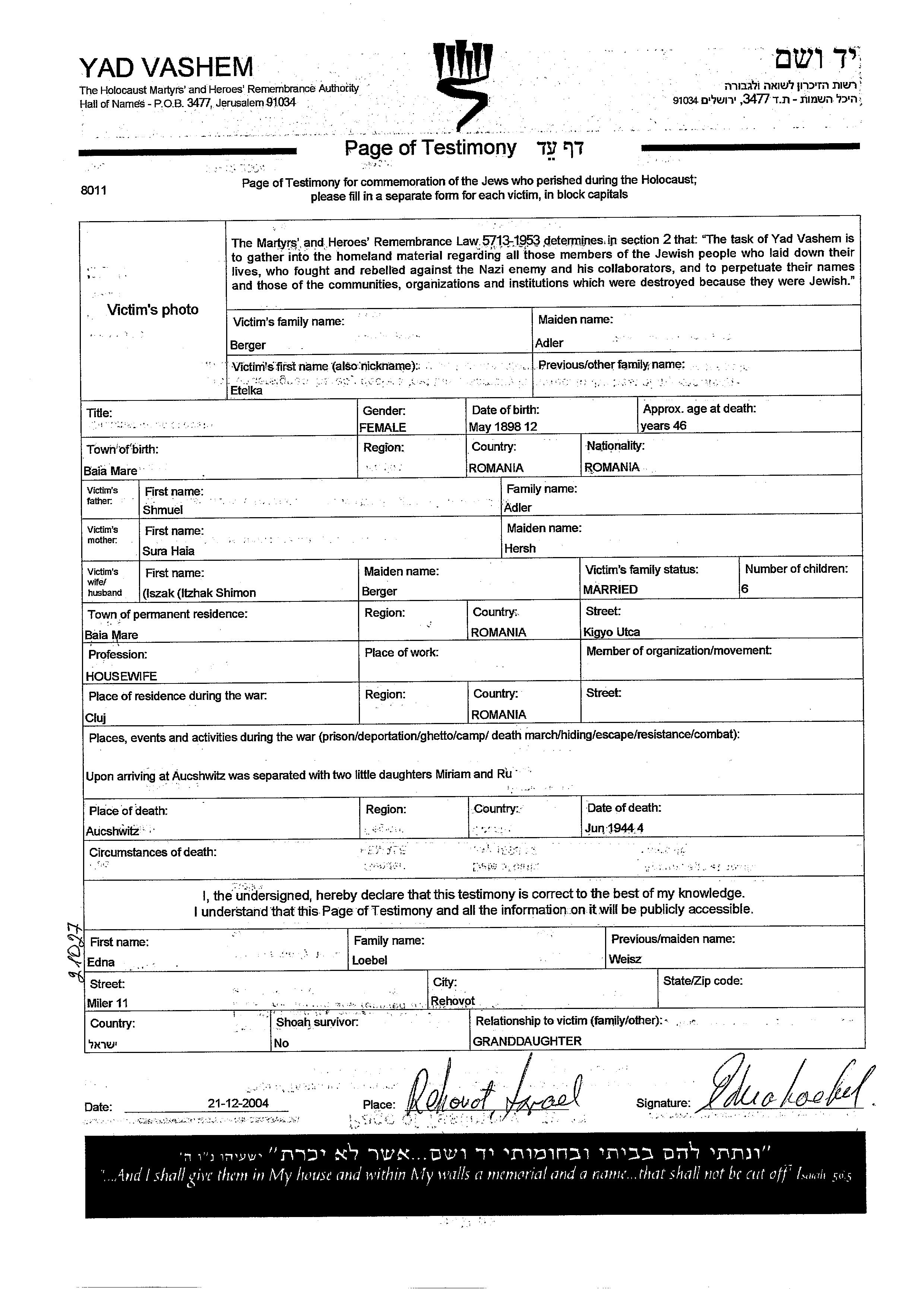 Etelka ברגר לבית אדלר נולדה בBaia Mare שברומניה בשנת 1898 לשמואל וHaia סורה לבית הרש. היא היתה נשואה לItzhak שמעון לבית ברגר. לפני מלחמת העולם השניה התגוררה בBaia Mare שברומניה. בזמן המלחמה היא היתה בCluj שברומניה. היא נרצחה בשואה. מקום המוות: Auschwitz שבפולין בשנת 04/06/1944.