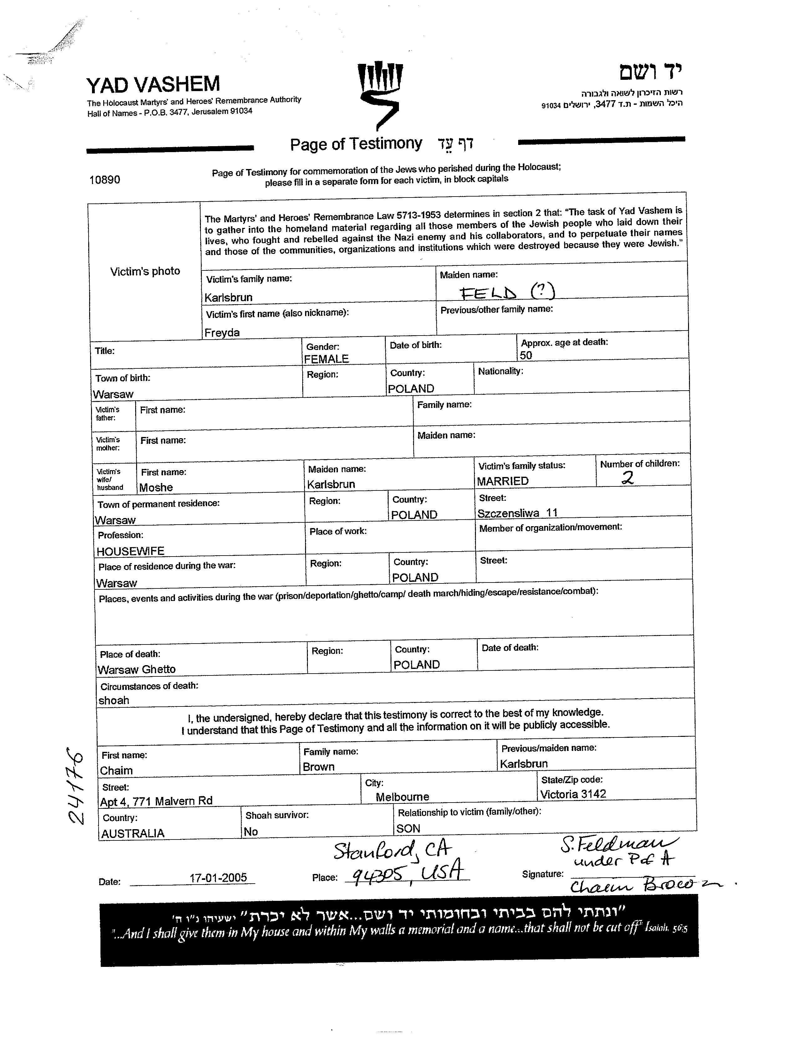 Freyda קרלסברון לבית פלד נולדה בWarszawa שבפולין. היא היתה נשואה למשה. לפני מלחמת העולם השניה התגוררה בWarszawa שבפולין. בזמן המלחמה היא היתה בWarszawa שבפולין.