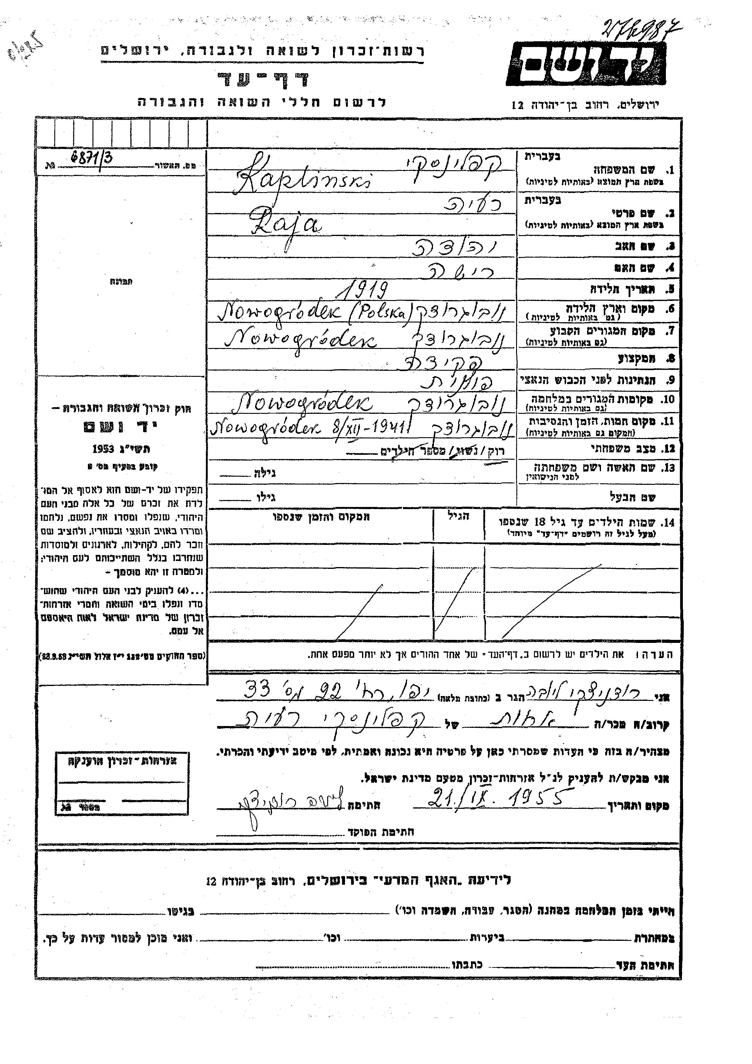 Raja קפלינסקי נולדה בNowogrodek שבפולין בשנת 1919 ליהודה ורישה. היא היתה פקידה ורווקה. לפני מלחמת העולם השניה התגוררה בNowogrodek שבפולין. בזמן המלחמה היא היתה בNowogrodek שבפולין.