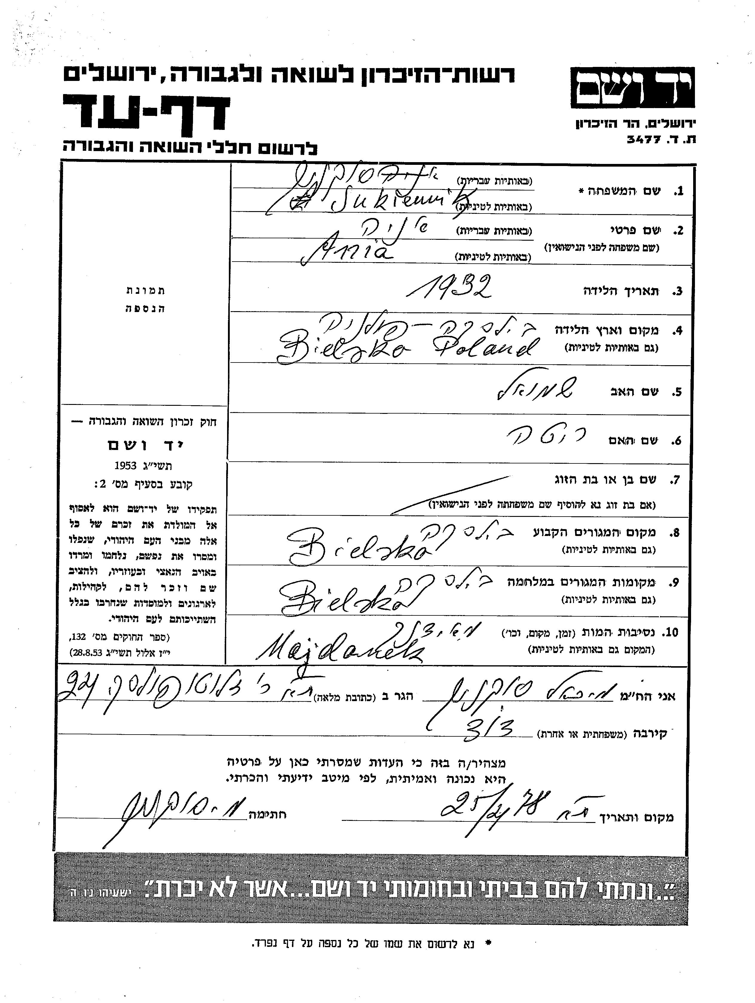 Ania Sukiennik נולדה בBielsko שבפולין בשנת 1932 לשמואל וריטה. היא היתה רווקה. לפני מלחמת העולם השניה התגוררה בBielsko שבפולין. בזמן המלחמה היא היתה בBielsko שבפולין. היא נרצחה בשואה. מקום המוות: Majdanek שבפולין.