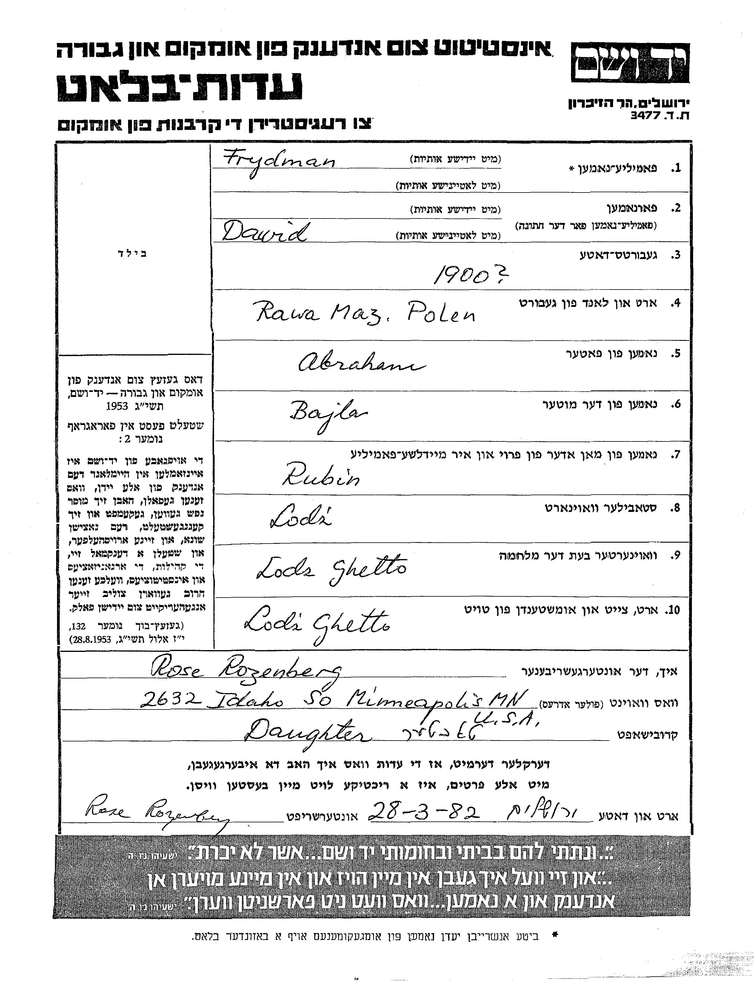 Dawid Frydman נולד בRawa Mazowiecka שבפולין בשנת 1900 לAbraham וBajla. לפני מלחמת העולם השניה התגורר בLodz שבפולין. בזמן המלחמה הוא היה בLodz שבפולין. הוא נרצח בשואה.