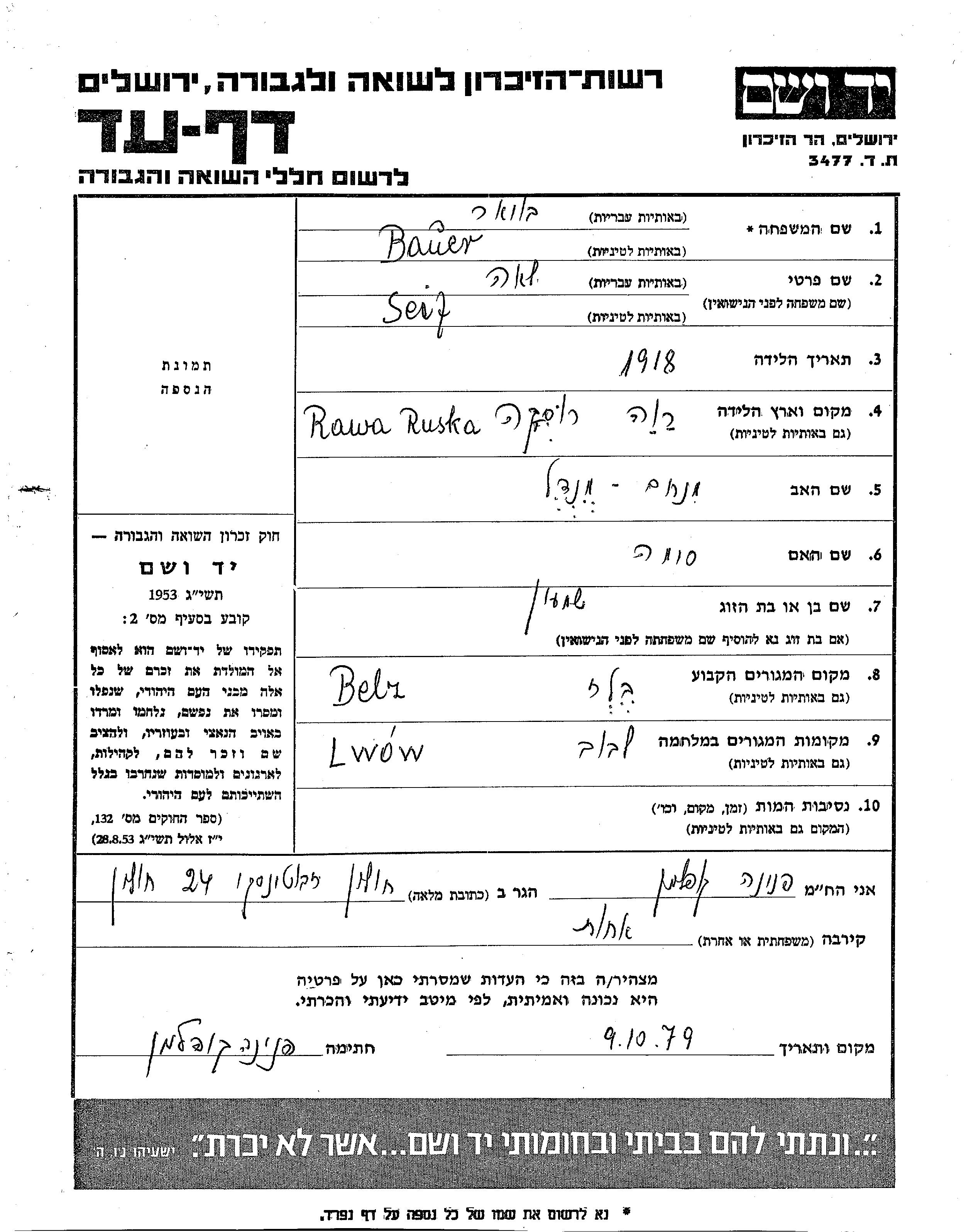 לאה באואר לבית סייף נולדה בRawa Ruska שבפולין בשנת 1918 למנחם מנדל וסימה. לפני מלחמת העולם השניה התגוררה בBelz שבפולין. בזמן המלחמה היא היתה בLwow שבפולין. לאה נרצחה בשואה.