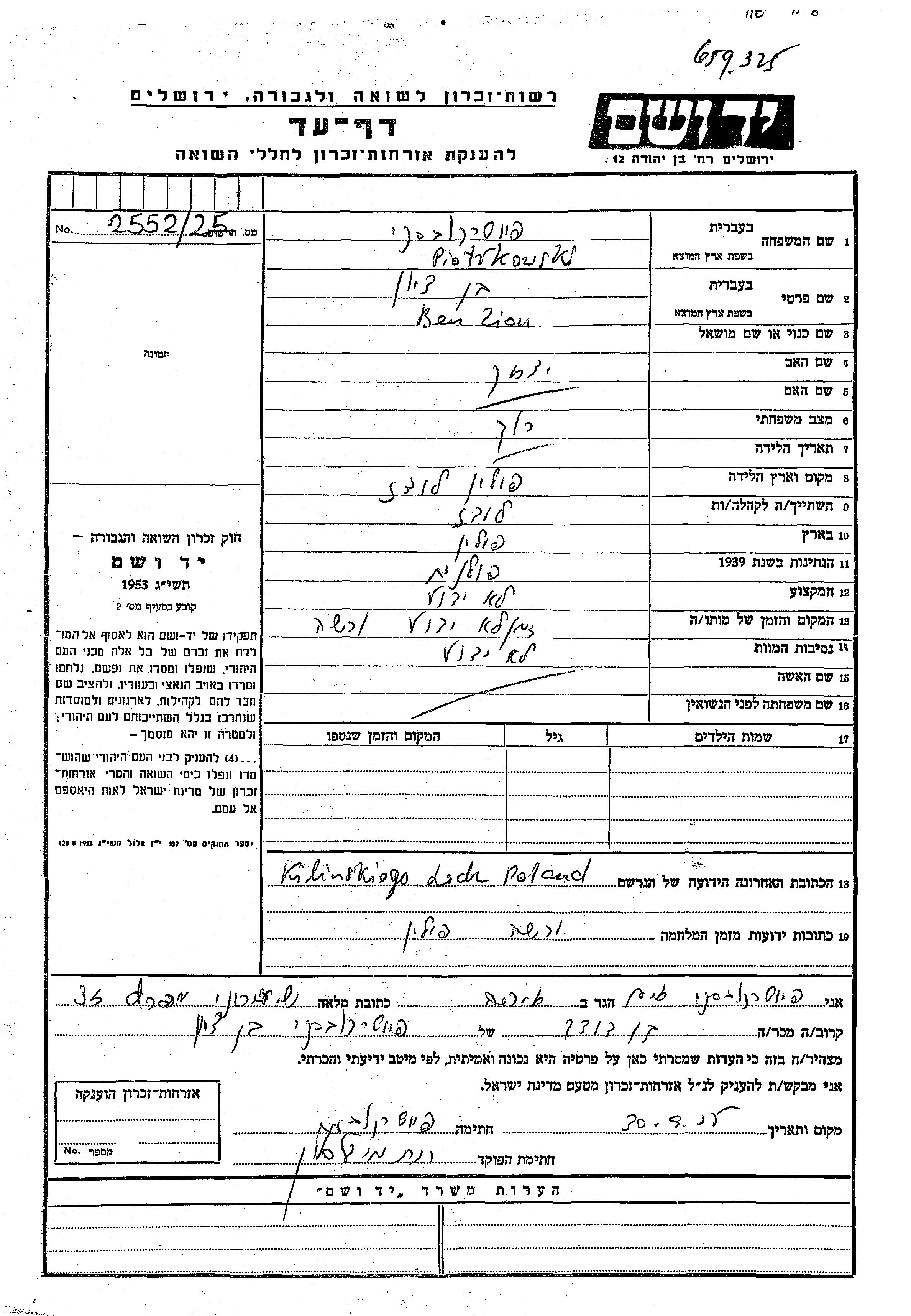 Ben Zion Piotrkowski נולד בLodz שבפולין ליצחק. הוא היה רווק. לפני מלחמת העולם השניה התגורר בLodz שבפולין. בזמן המלחמה הוא היה בWarszawa שבפולין. הוא נרצח בשואה. מקום המוות: Warszawa שבפולין.