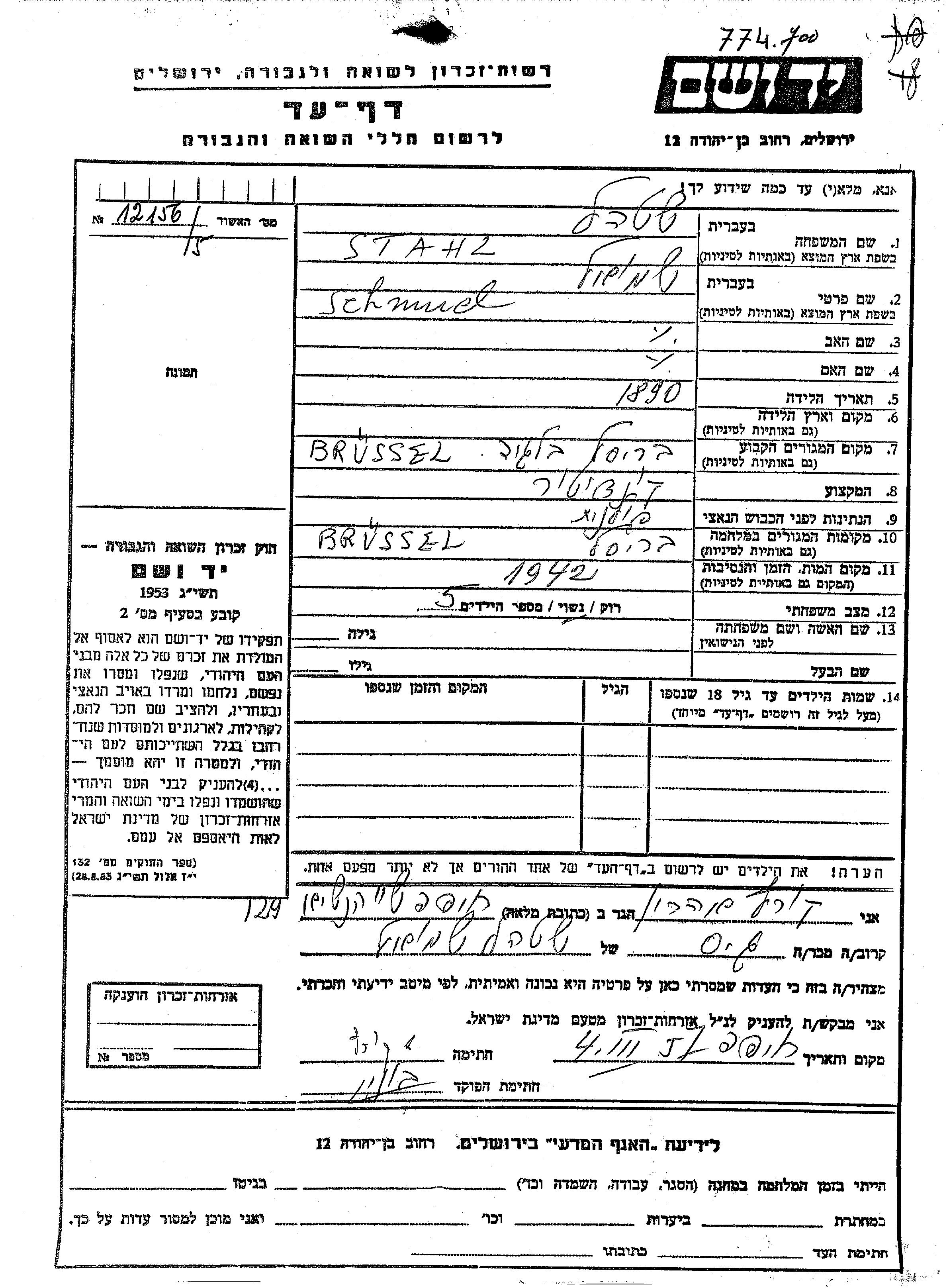 Schmuel Stahl נולד בשנת 1890. הוא היה קונדיטור ונשוי. לפני מלחמת העולם השניה התגורר בBrussels שבבלגיה. בזמן המלחמה הוא היה בBrussels שבבלגיה.