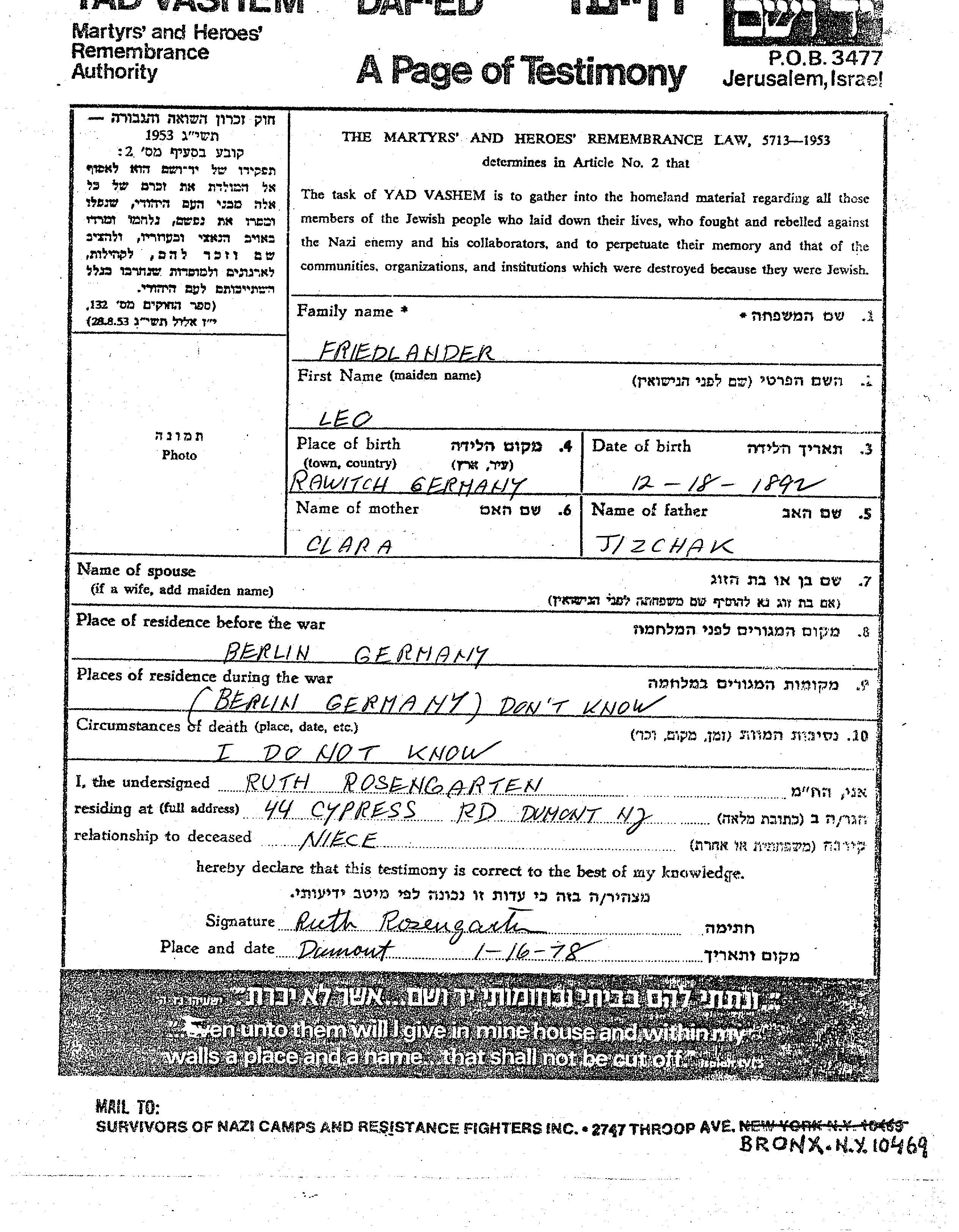 ליאו Friedlander נולד בRawitsch שבפולין בשנת 1892 לJizchak וClara. לפני מלחמת העולם השניה התגורר בBerlin שבגרמניה. בזמן המלחמה הוא היה בBerlin שבגרמניה.
