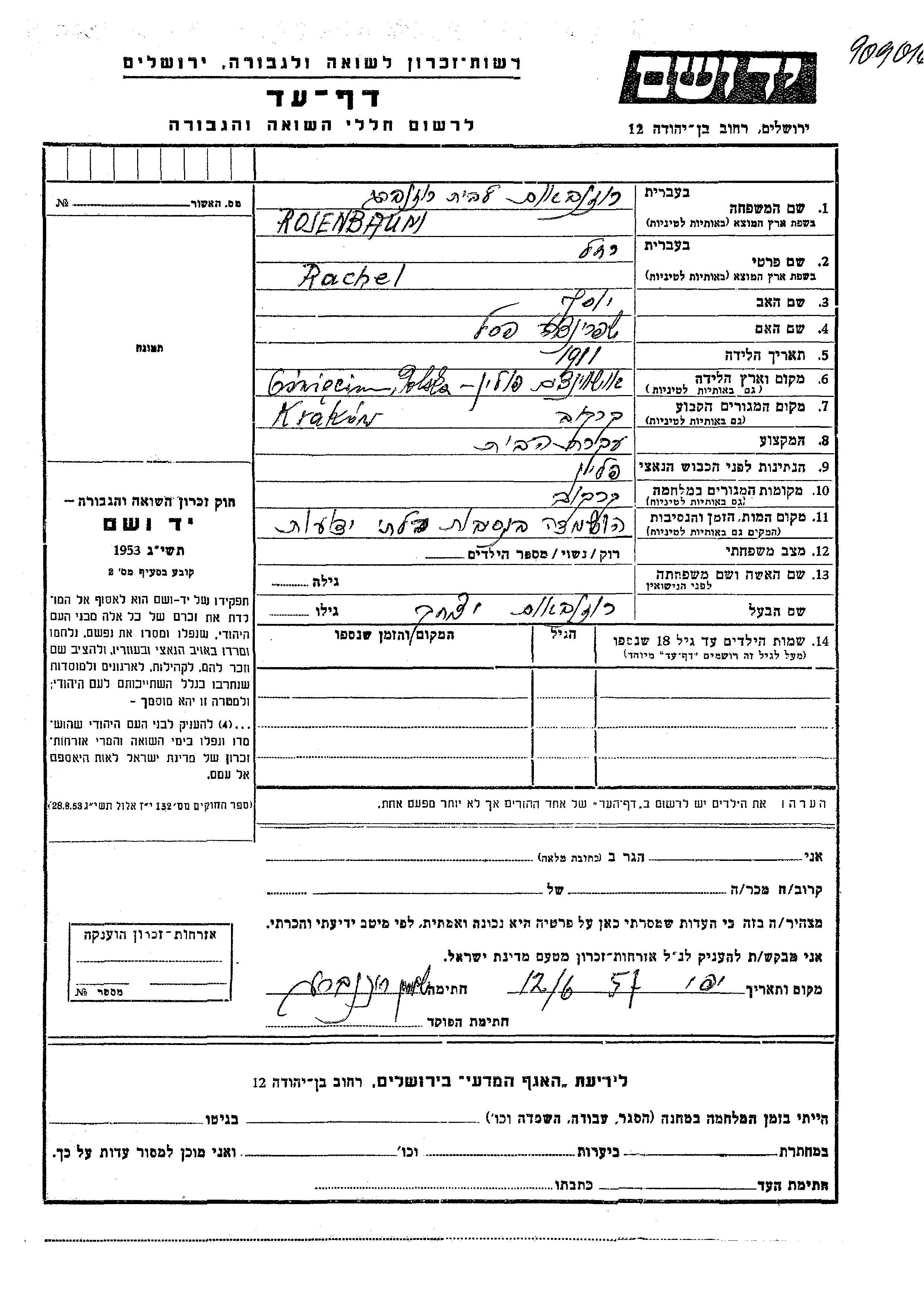 רחל Rosenbaum לבית רוזנברג נולדה בOświęcim שבפולין בשנת 1911 ליוסף ושפרינצה פסל. היא היתה עקרת בית ונשואה ליצחק. לפני מלחמת העולם השניה התגוררה בKrakow שבפולין. בזמן המלחמה היא היתה בKrakow שבפולין. רחל נרצחה בשואה.