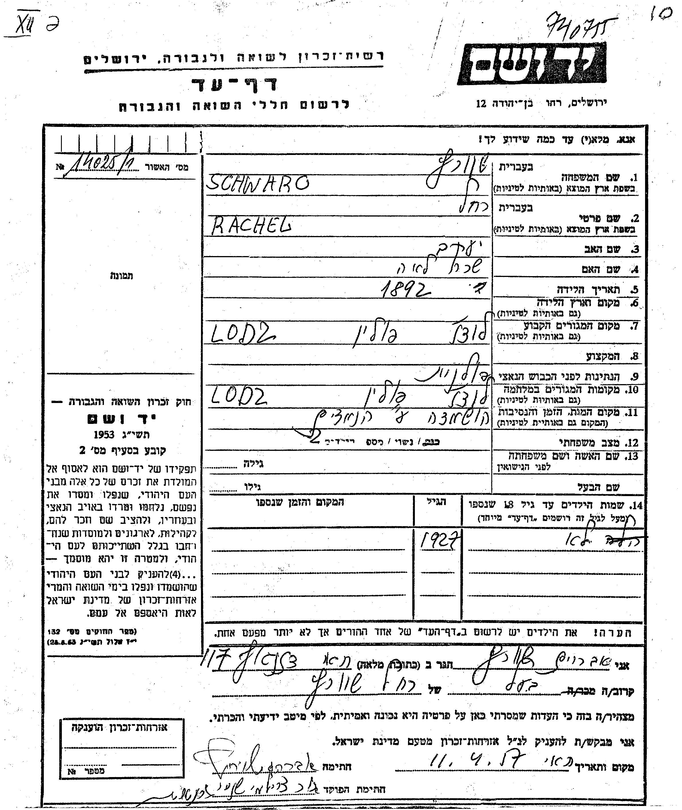 רחל Schwarc נולדה בLodz שבפולין בשנת 1892 ליעקב ושרה לאה. היא היתה נשואה. בזמן המלחמה היא היתה בLodz שבפולין.
