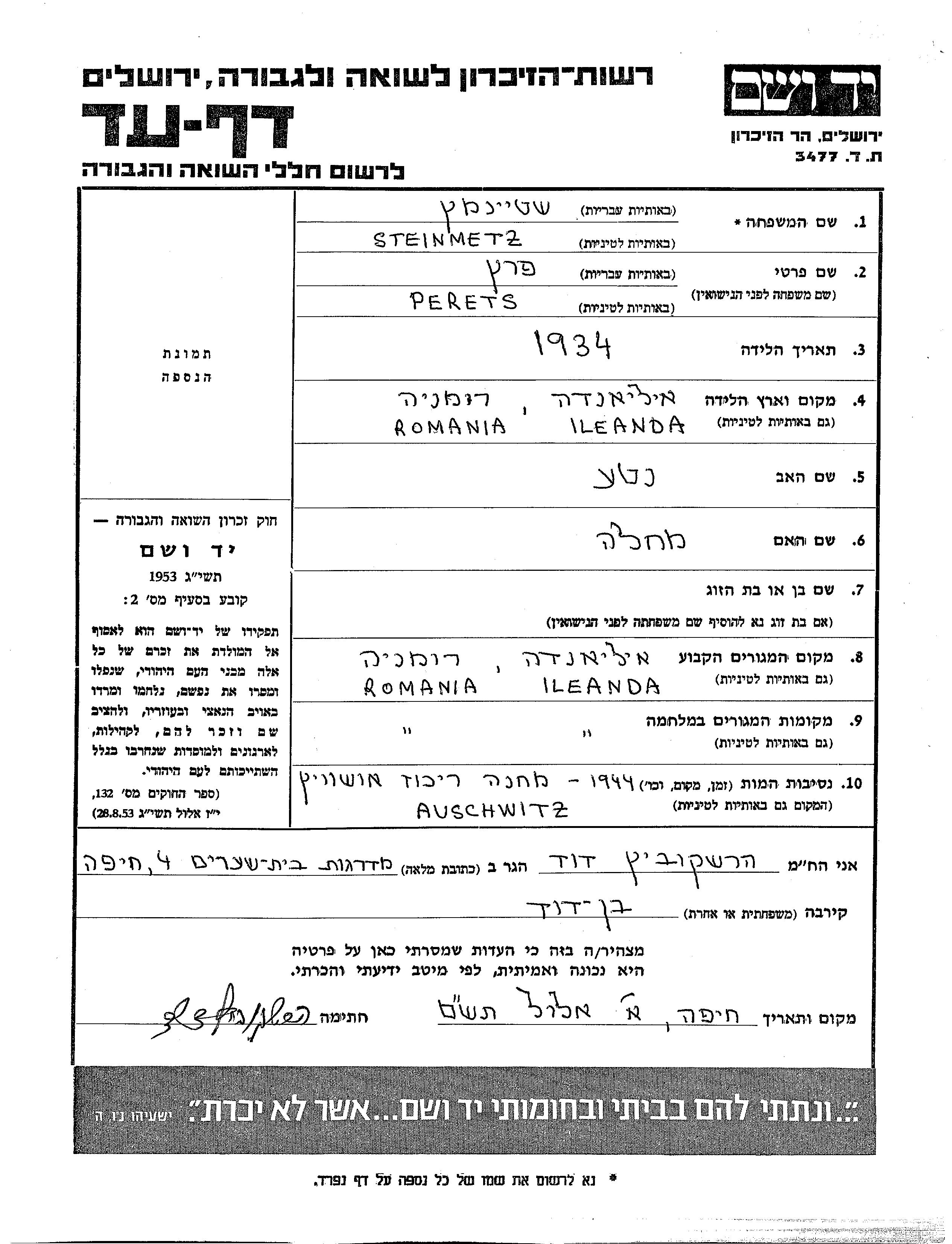 Steinmetz Perets 1934 Ileanda, רומניה דף-עד