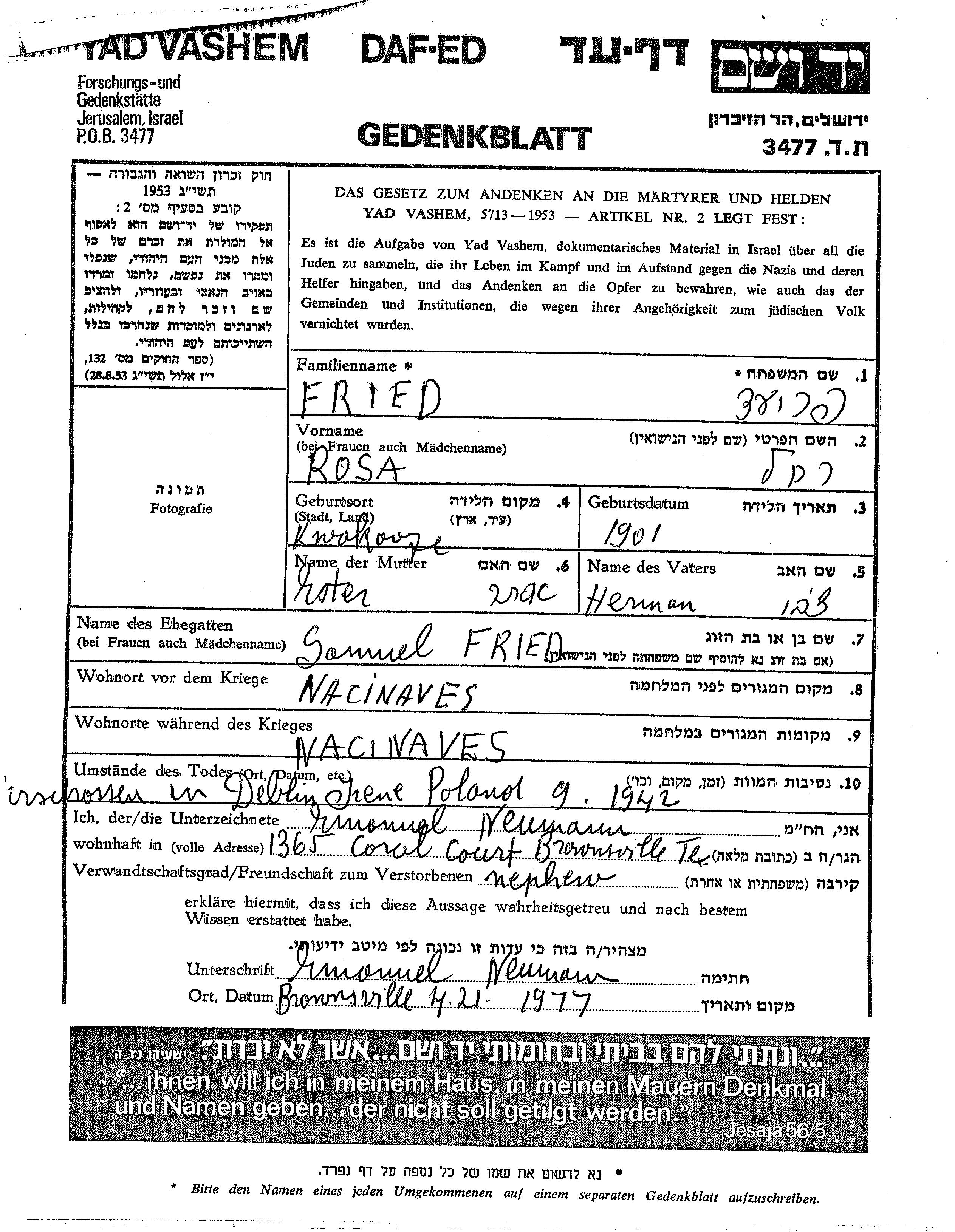 Rosa רחל Fried נולדה בשנת 1901 להרמן צבי ואסתר. היא היתה נשואה לסמואל. לפני מלחמת העולם השניה התגוררה בNacina Ves שבצ'כוסלובקיה. בזמן המלחמה היא היתה בNacina Ves שבצ'כוסלובקיה.