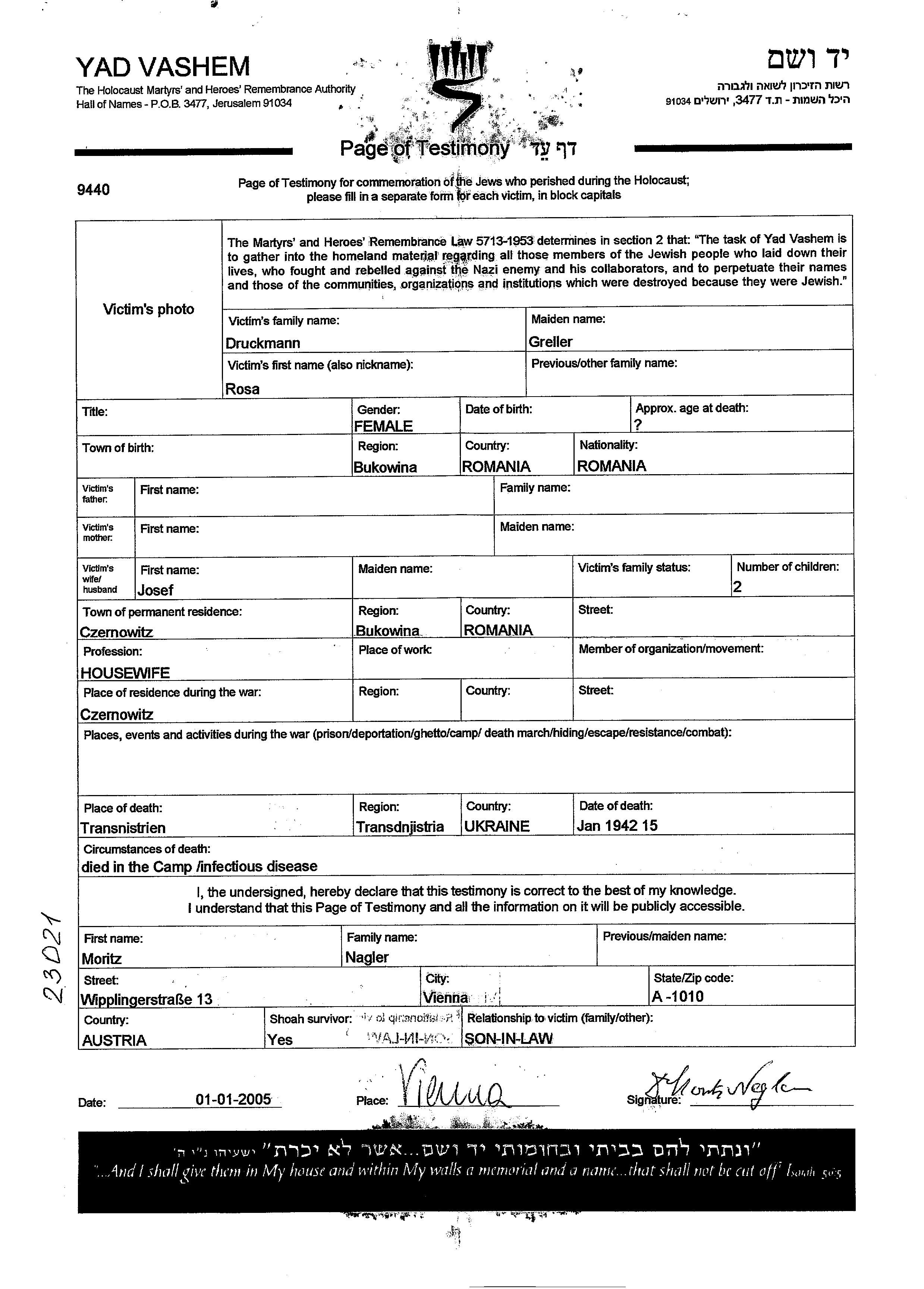 Rosa Druckmann לבית Greller נולדה בBukovina,רומניה שברומניה. לפני מלחמת העולם השניה התגוררה בCzernowitz שברומניה. בזמן המלחמה היא היתה בCzernowitz שברומניה. היא נרצחה בשואה. מקום המוות: Transnistria שבאוקראינה (ברה"מ) בשנת 15/01/1942.